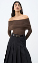 A long-sleeved woolen knit top with an open shoulder line.