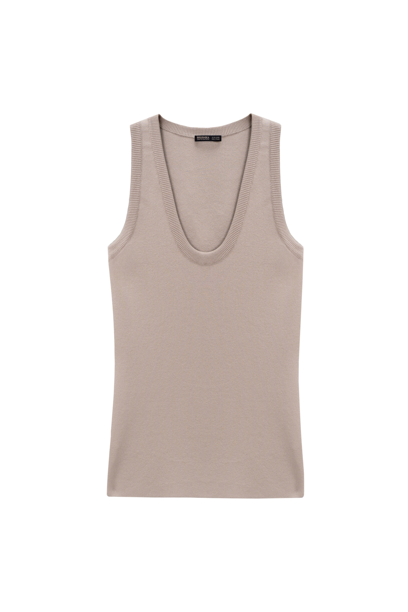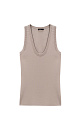 Viscose knit top. The model has a fitted silhouette, a U-shaped neckline, and deep armholes.