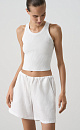 Ribbed viscose knit tank top. Model with deep armhole, arched bottom and U-shaped neckline with a roll.