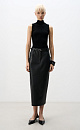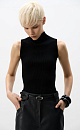 Viscose knit top. The model has a fitted silhouette, is sleeveless and has a low stand collar.