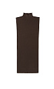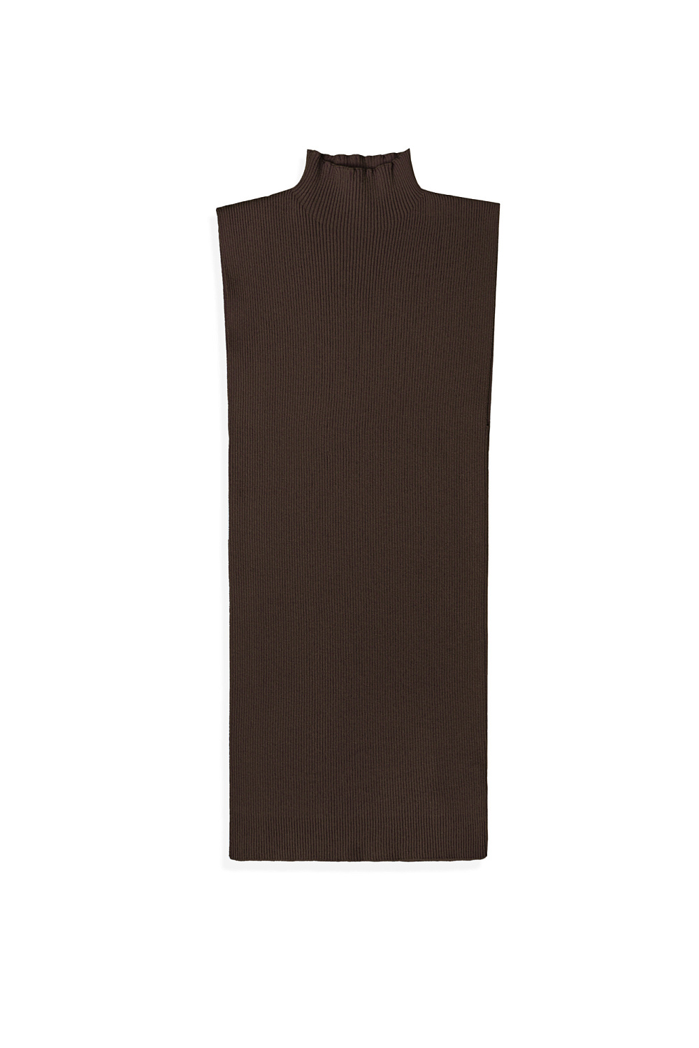 Viscose knit top. The model has a fitted silhouette, is sleeveless and has a low stand collar.
