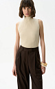Viscose knit top. The model has a fitted silhouette, is sleeveless and has a low stand collar.