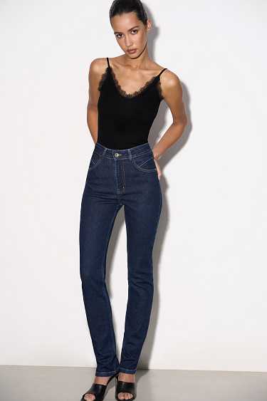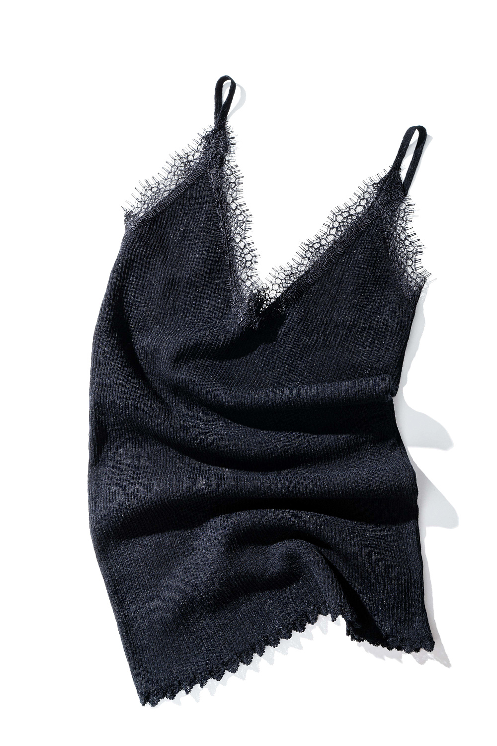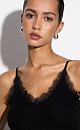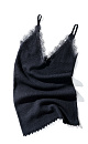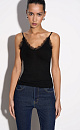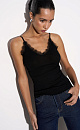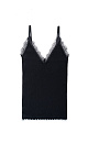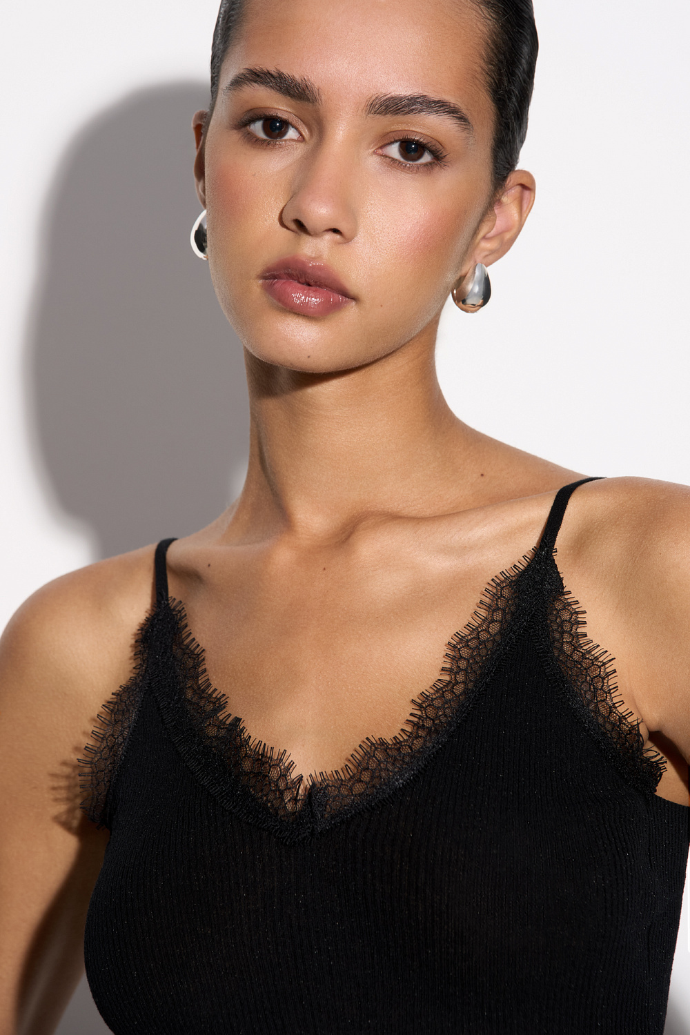 Knitted top made of fine cotton. Ribbed model with thin straps and a deep neckline. The product is decorated with lace.