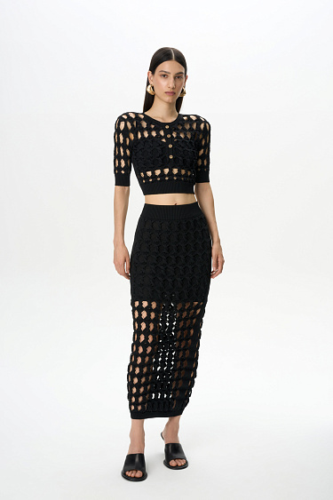 Knitted top with large openwork weave. Round neckline with button placket. Features wide textured elastic band on the sleeves and at the bottom. Includes top with thin straps.