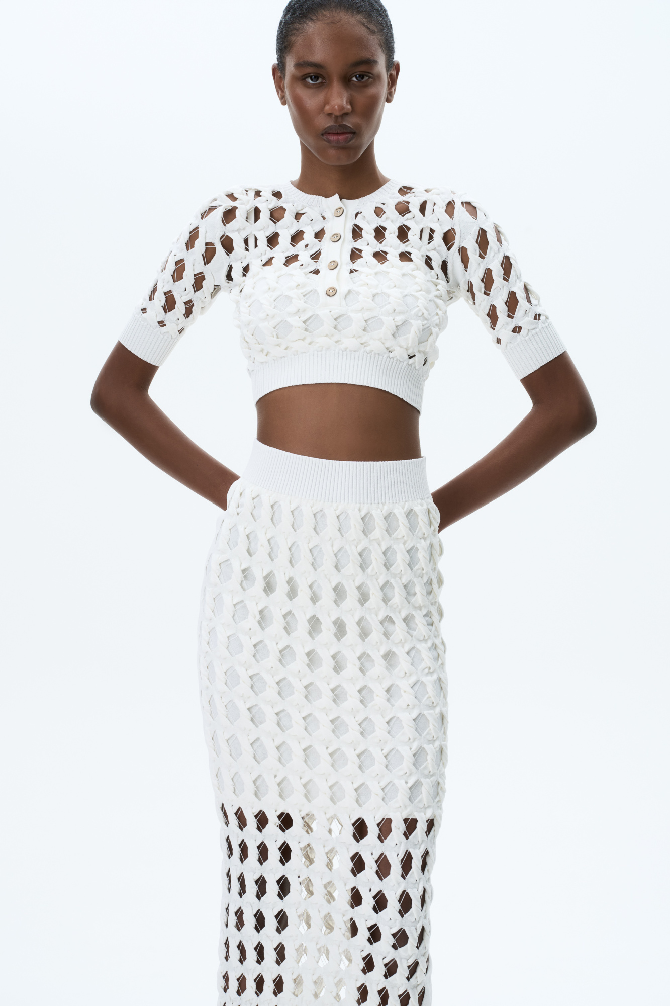 Knitted top with large openwork weave. Round neckline with button placket. Features wide textured elastic band on the sleeves and at the bottom. Includes top with thin straps.