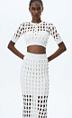 Knitted top with large openwork weave. Round neckline with button placket. Features wide textured elastic band on the sleeves and at the bottom. Includes top with thin straps.