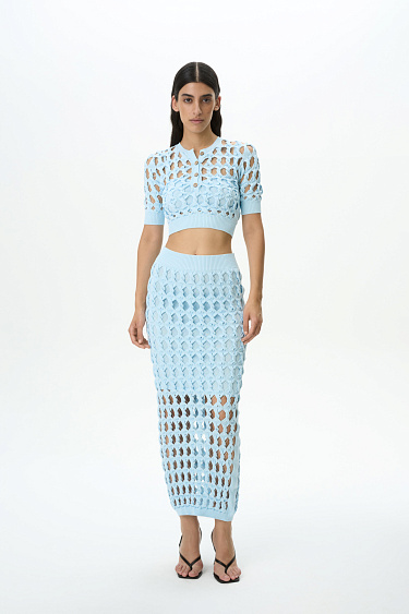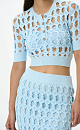 Knitted top with large openwork weave. Round neckline with button placket. Features wide textured elastic band on the sleeves and at the bottom. Includes top with thin straps.