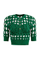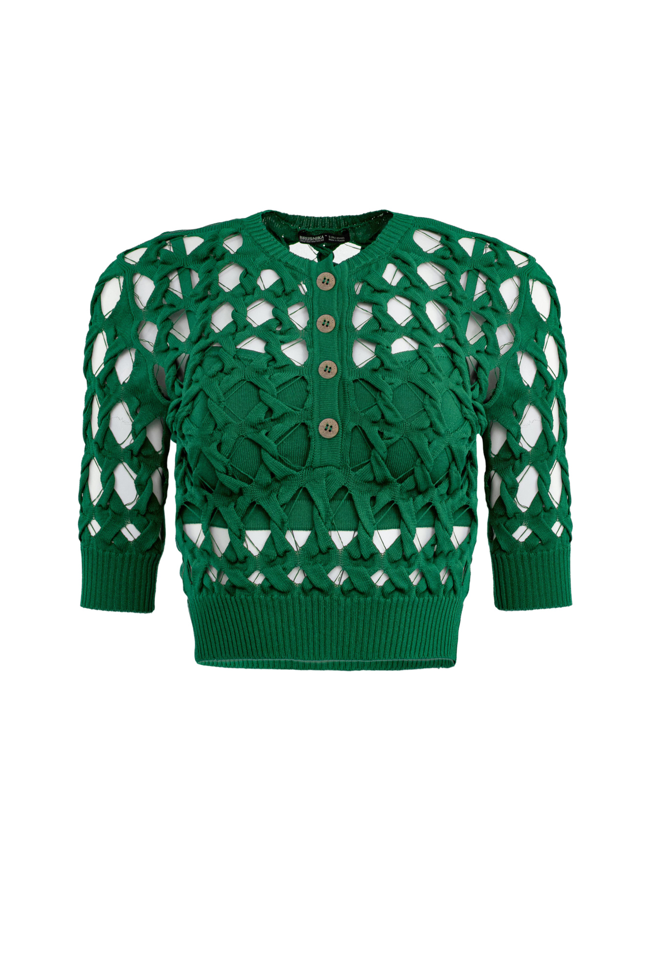 Knitted top with large openwork weave. Round neckline with button placket. Features wide textured elastic band on the sleeves and at the bottom. Includes top with thin straps.