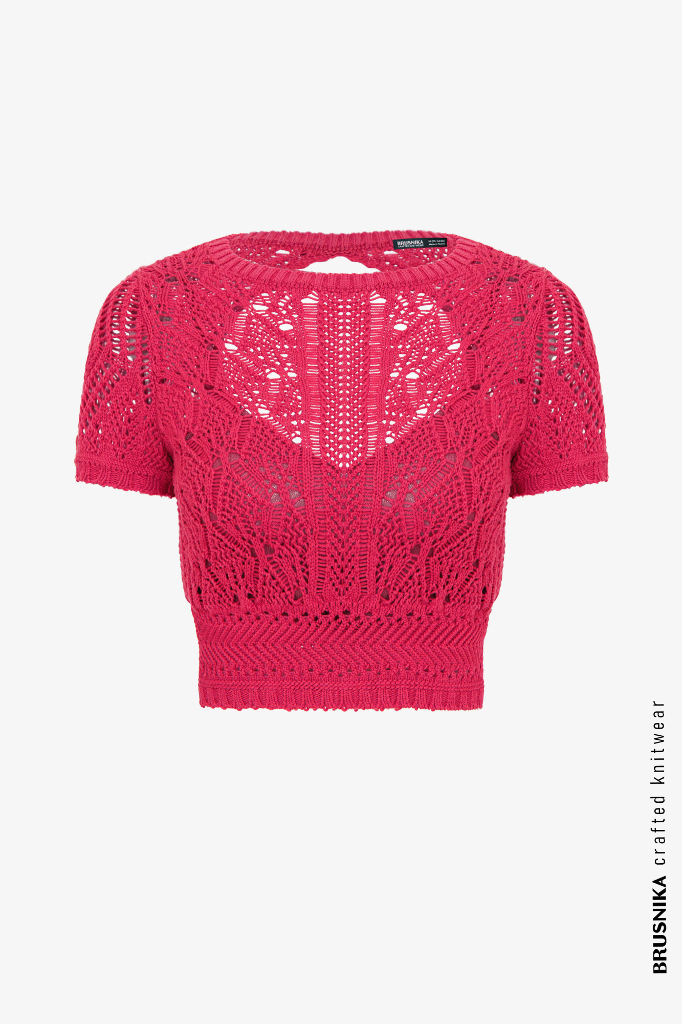 Knitted openwork top made of cotton with added elastane. Model with short sleeves and open back.