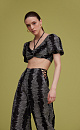 Short top made of 100% textured linen. Model with short puff sleeves, deep neckline and thin drawstring around the neck.