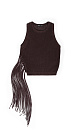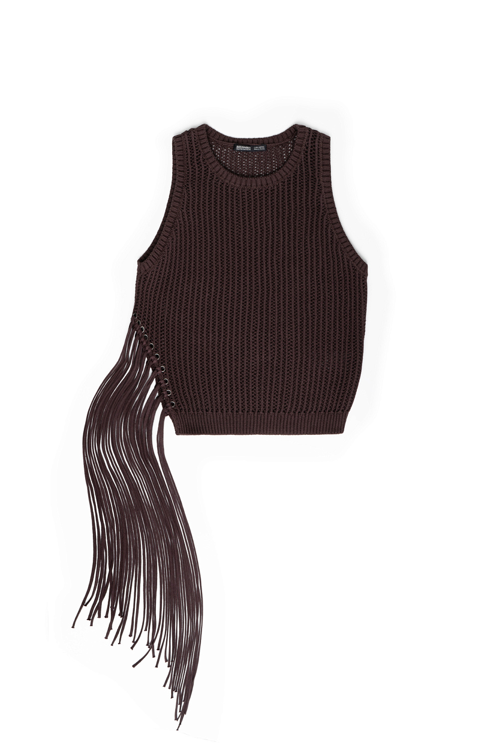 Knitted openwork top made of 100% cotton. The model has a straight silhouette, sleeveless, and a round neckline. The product is decorated with long fringe and eyelets.