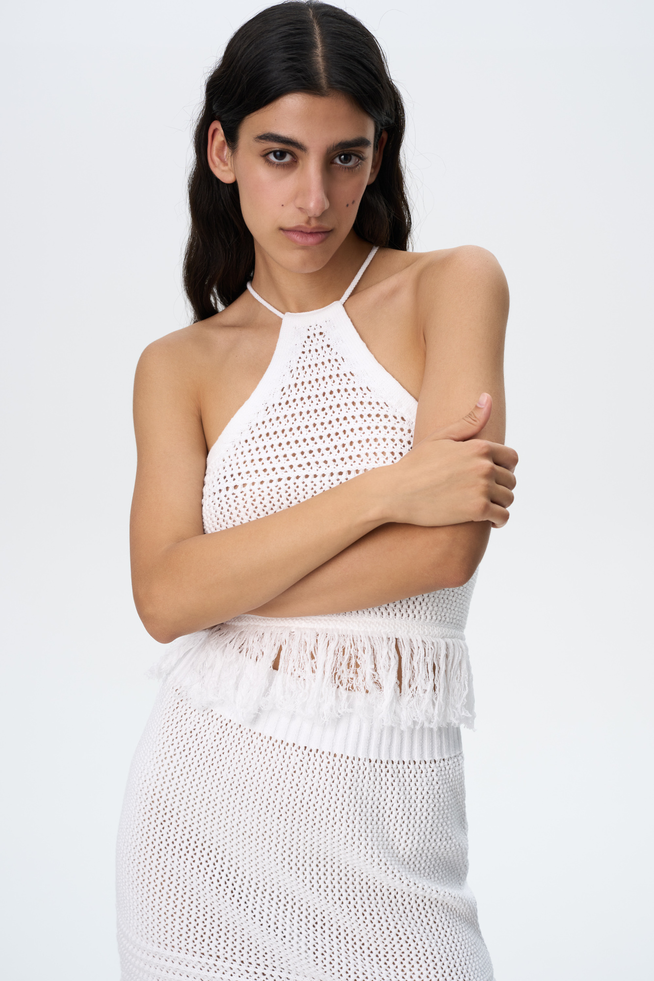 Sleeveless 100% cotton knit top with thin straps, lace-up back and fringed hem.