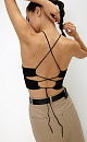 Ribbed viscose knit top. Open back with drawstring and thin straps.