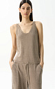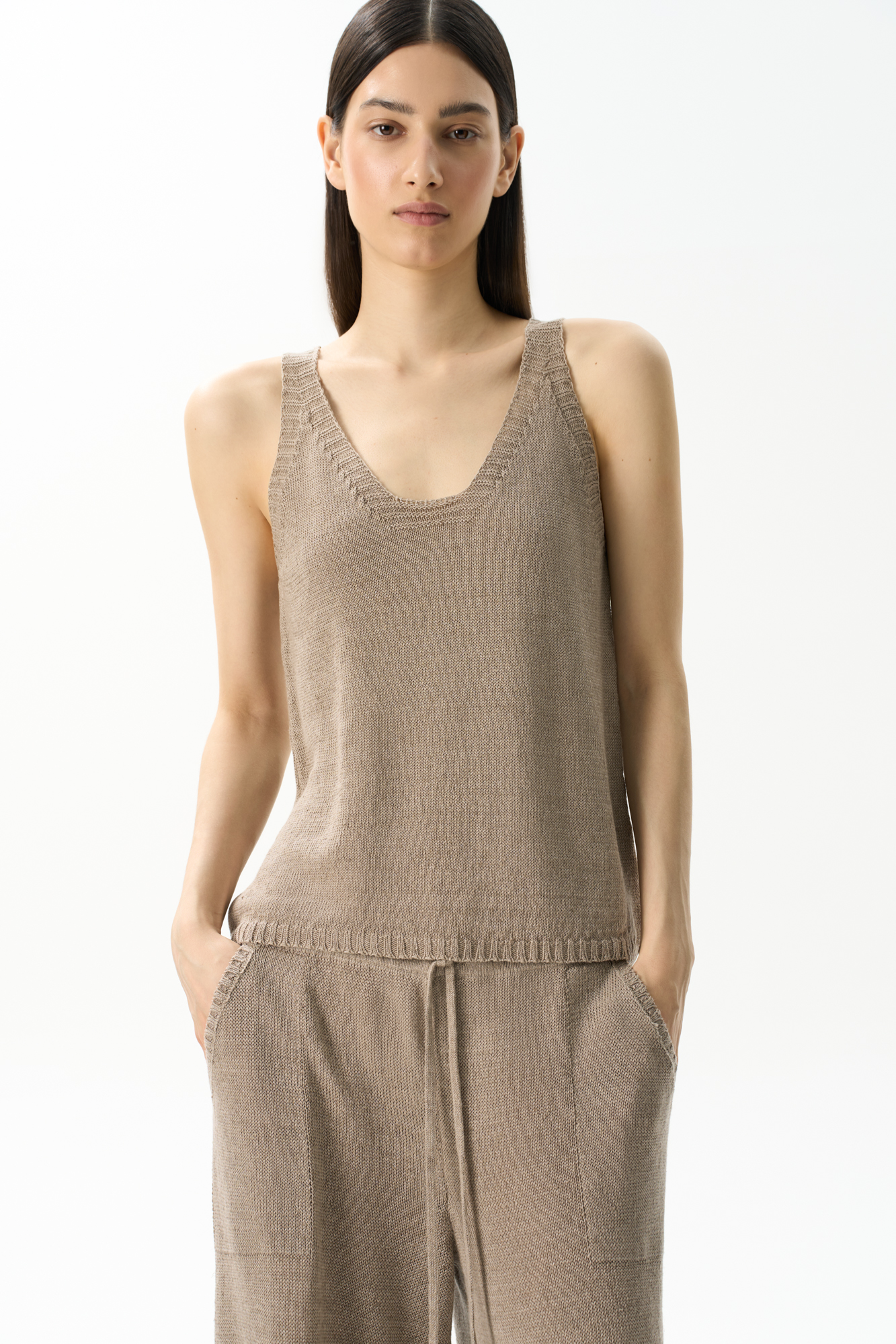 Knitted top made of 100% linen. The model has a straight cut, wide straps, a deep armhole and a U-shaped neckline. The edges of the product are ribbed.