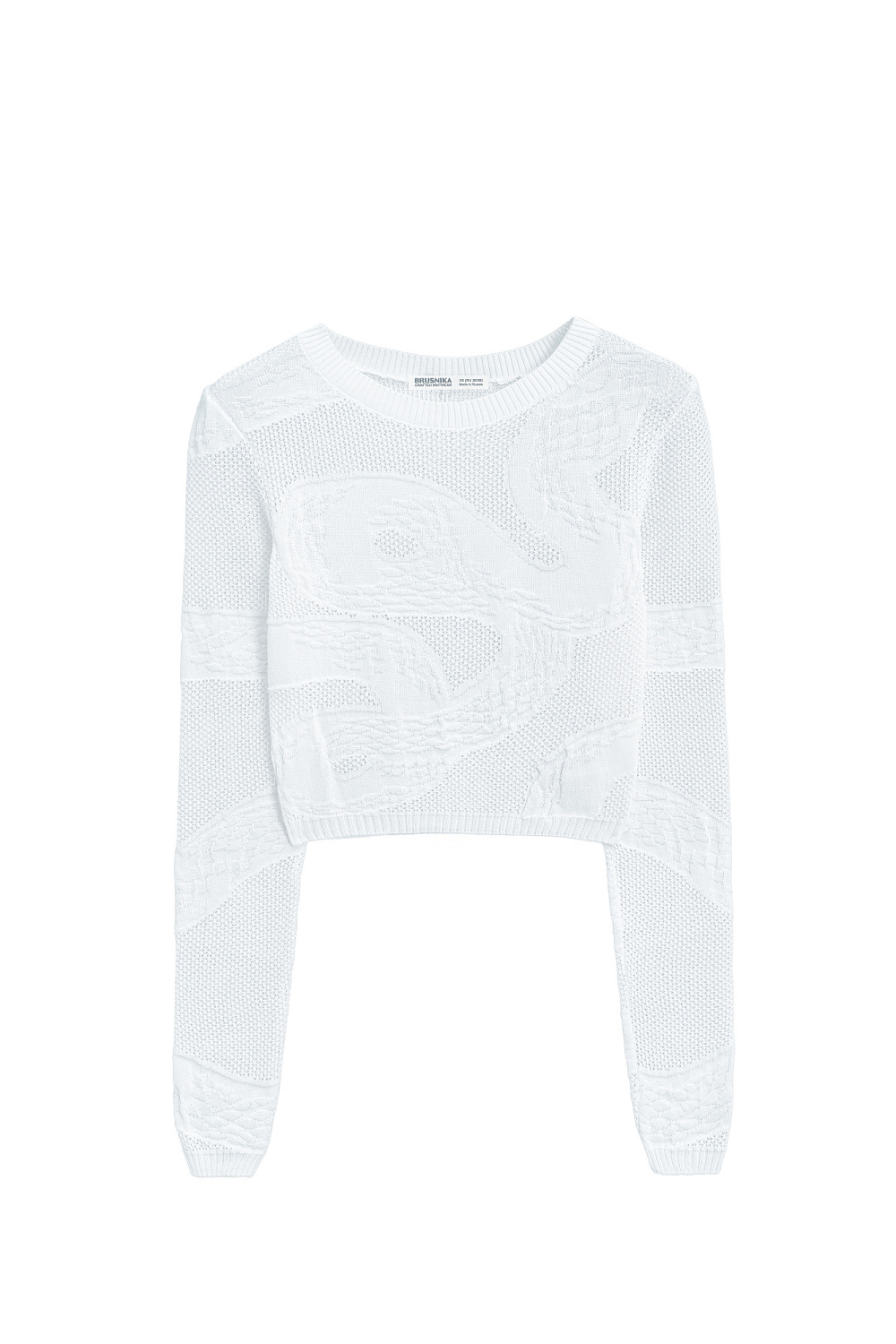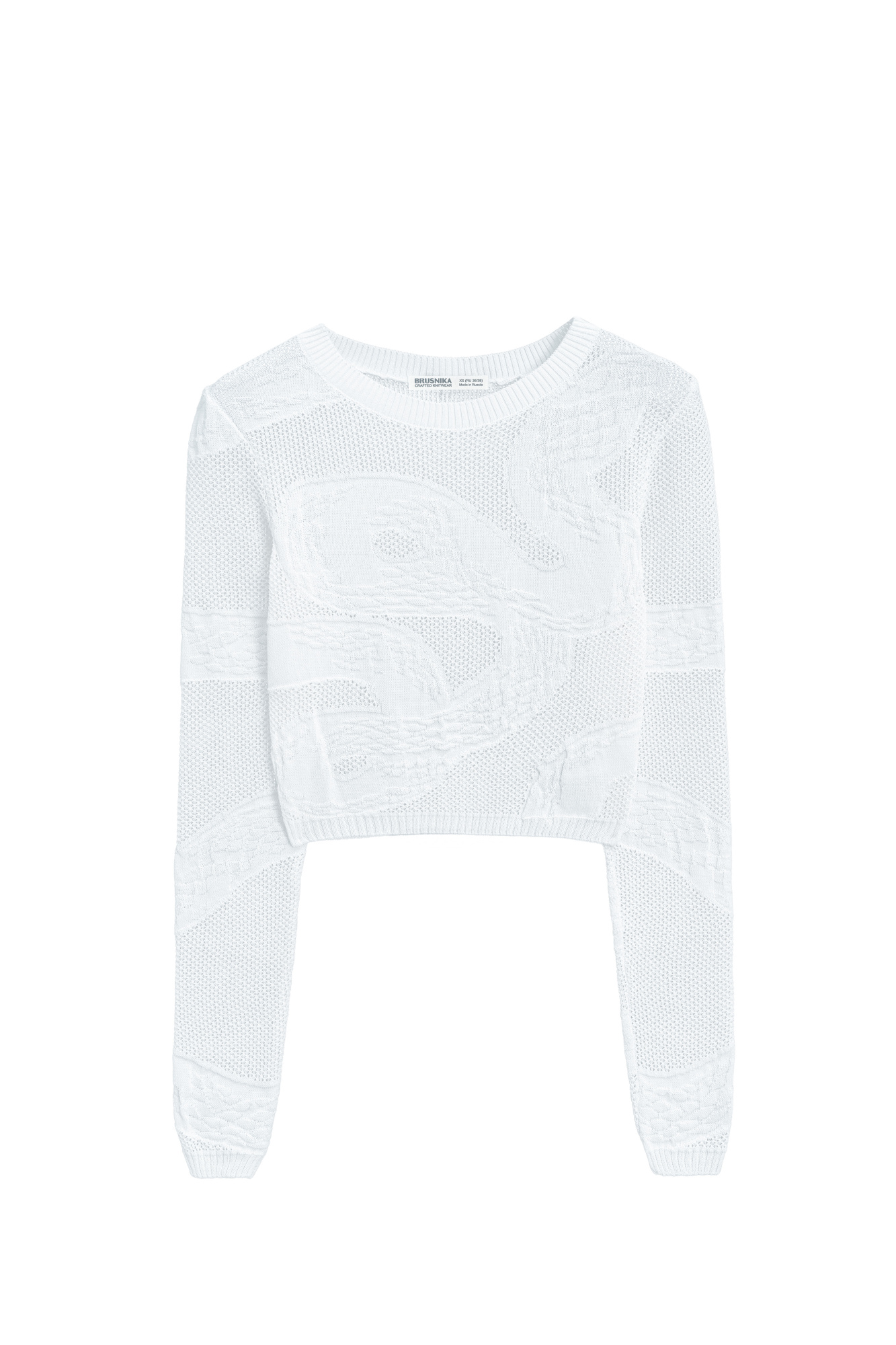Organic cotton knitted top. Molel has a short silhouette, long sleeves and a round neckline. The product is decorated with a jacquard pattern in the shape of a snake. No lining.