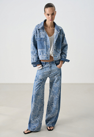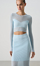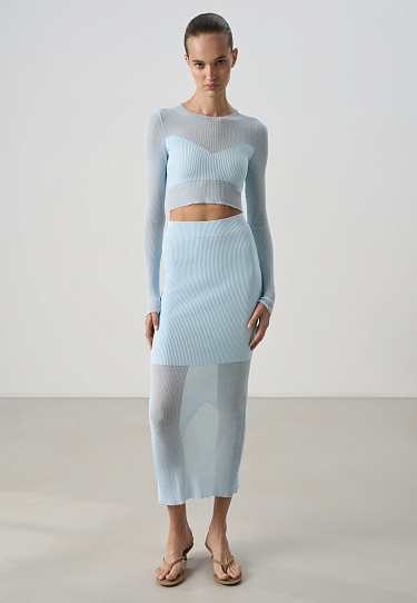 A knitted crop top made of fine cotton with the addition of viscose. The model has a fitted silhouette, long sleeves, and a round neckline. The product is made in a combined knitting, combining translucent and denser textures, creating an emphasis on the bodice.