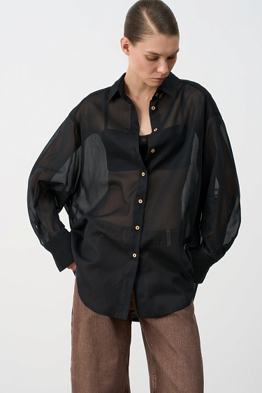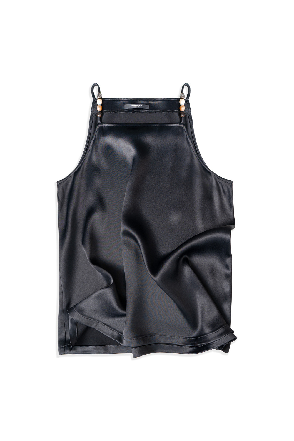 Viscose satin top. The model has a loose silhouette, a straight, shallow neckline, and thin straps decorated with beads.