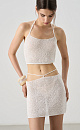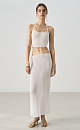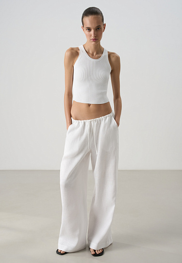 Knitted short top made of cotton with viscose added. Straight cut model with an open back and two tie straps at the neck. No lining.
