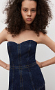 Denim corset made of 100% cotton. The model has a textured bodice and a flared silhouette. The product is decorated with contrasting stitching. It has a zipper on the back.