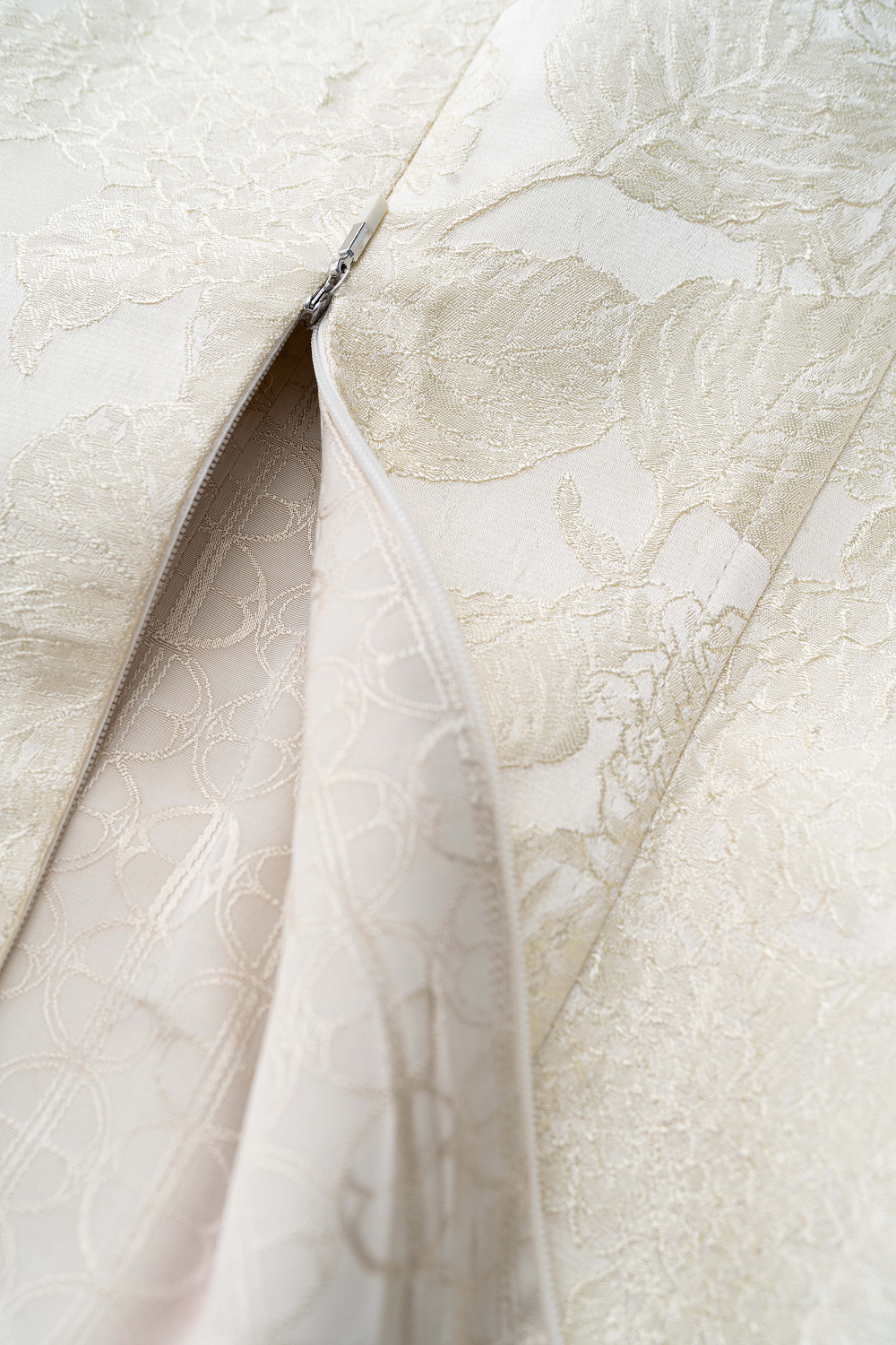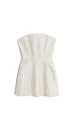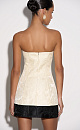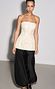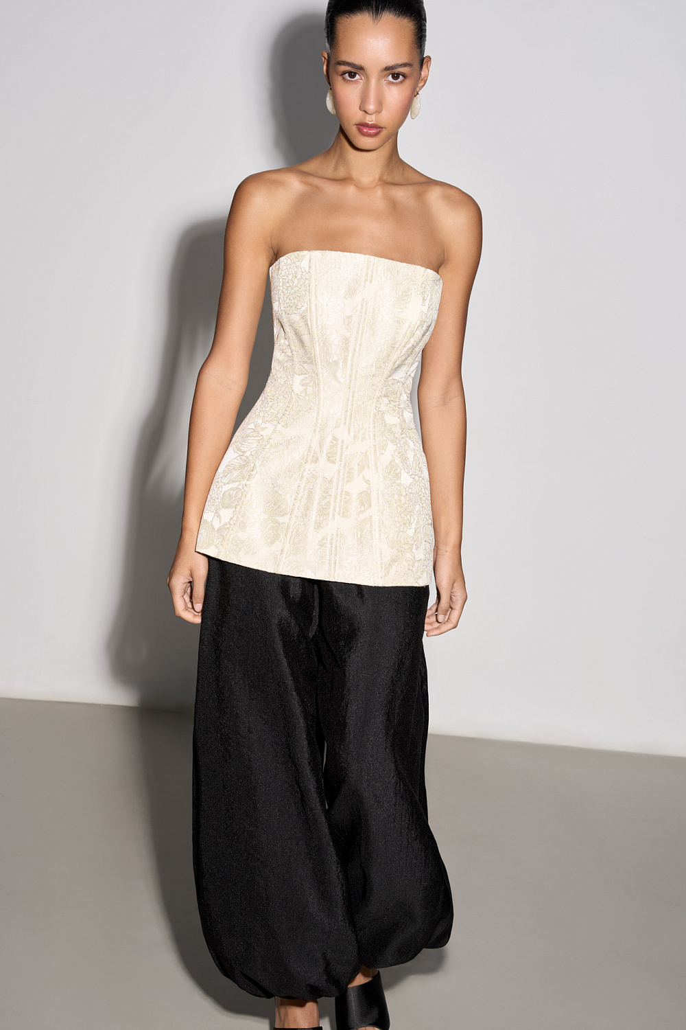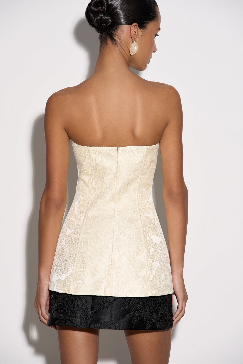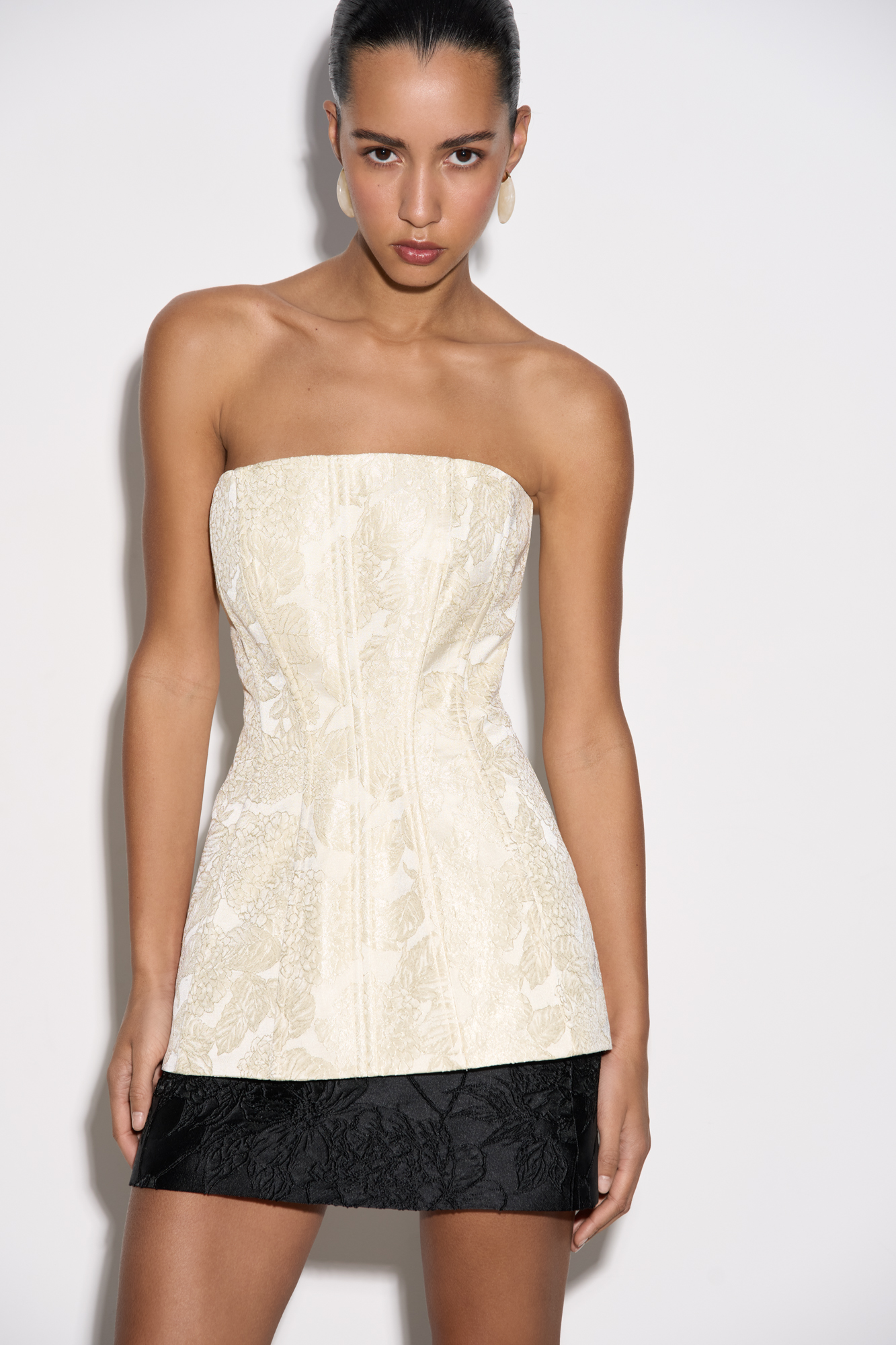 Elongated jacquard corset. The model has a fitted silhouette, with a hidden zipper at the back. The product is lined.