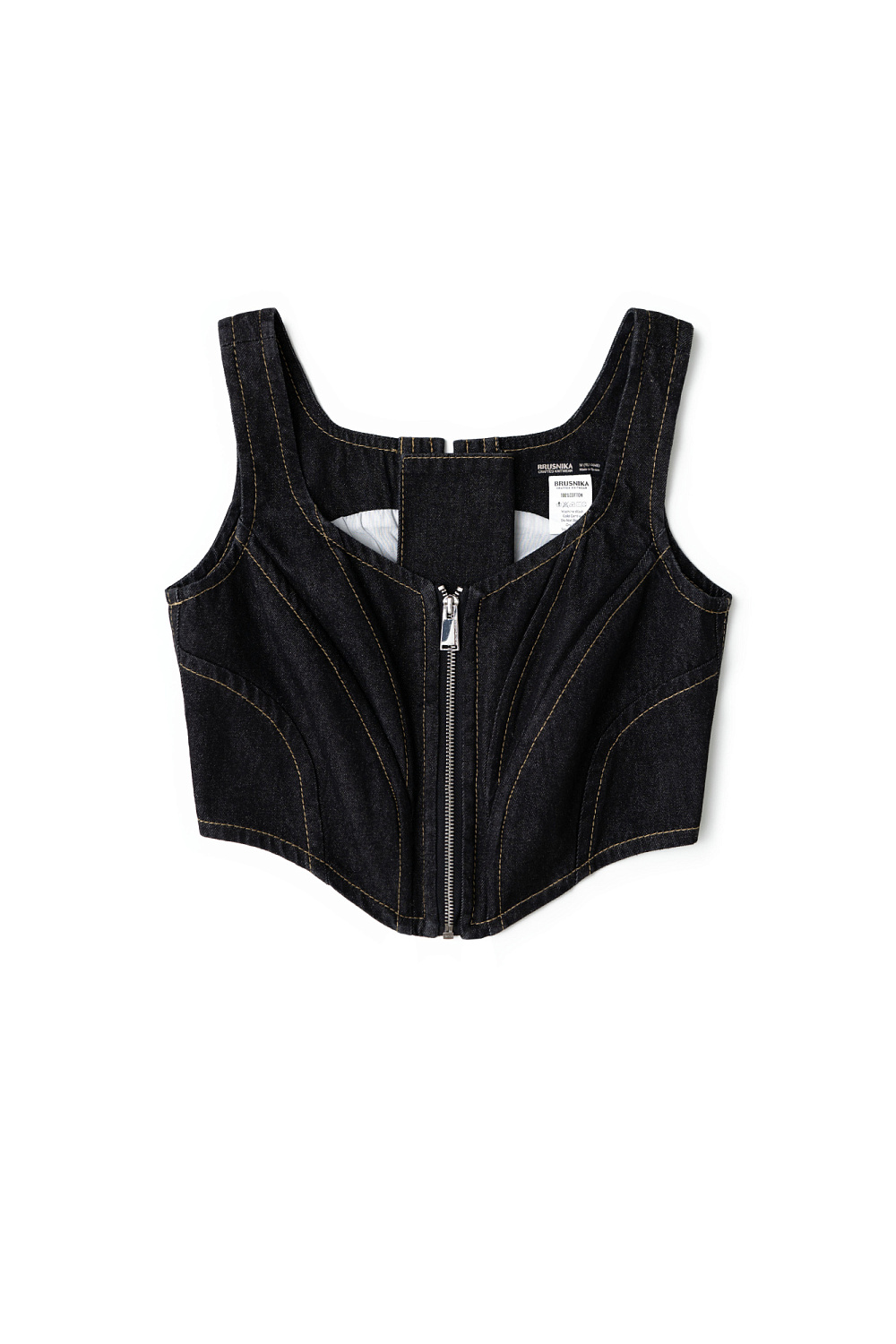 100% cotton denim corset with zip fastening and ribbon tie at the back. You can complement the look with jeans and a denim jacket.