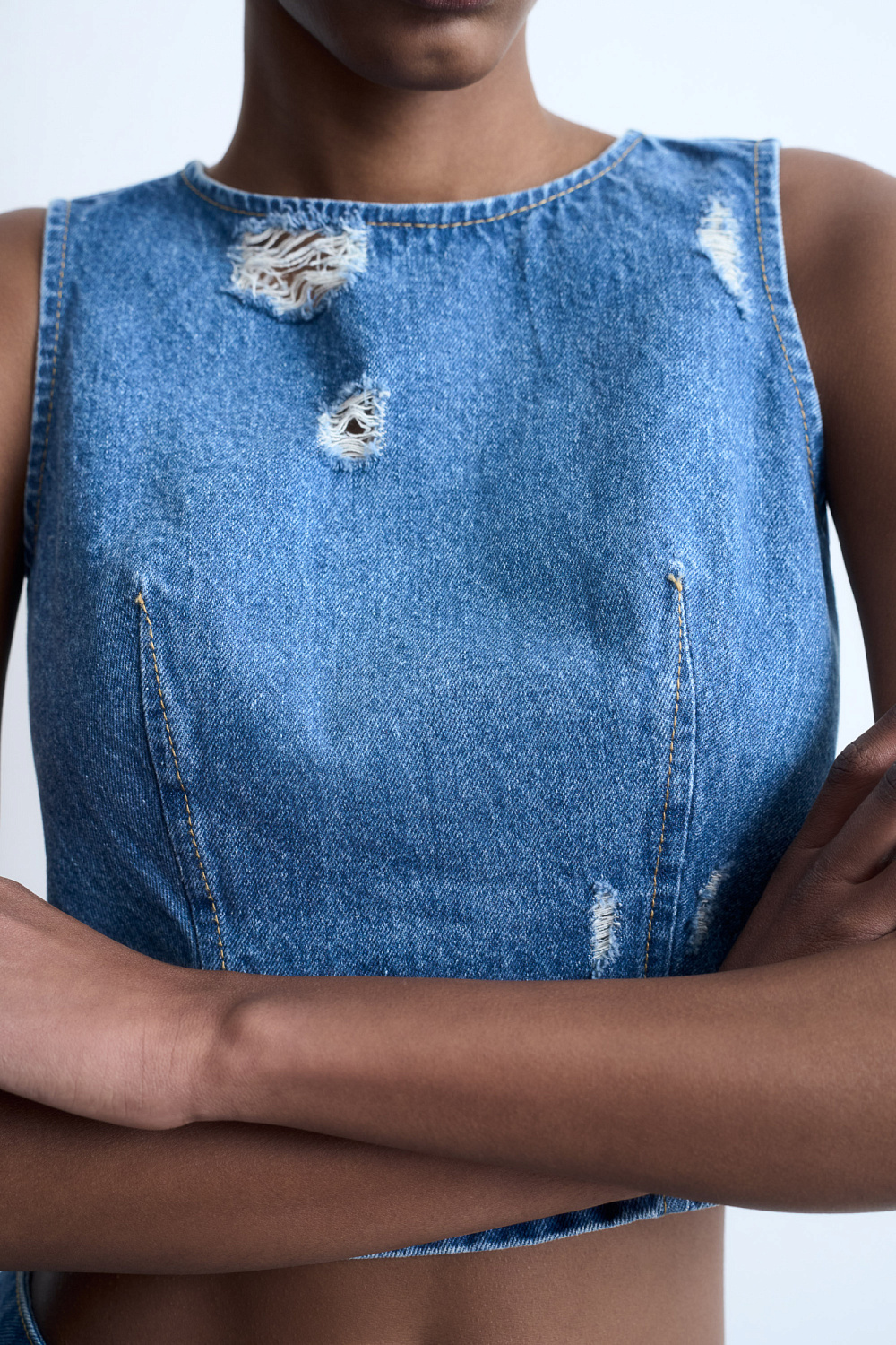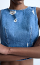 Denim top with slits in grunge style. The model has a fitted silhouette and a zipper on the back. You can complete the look with a matching skirt.