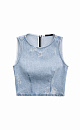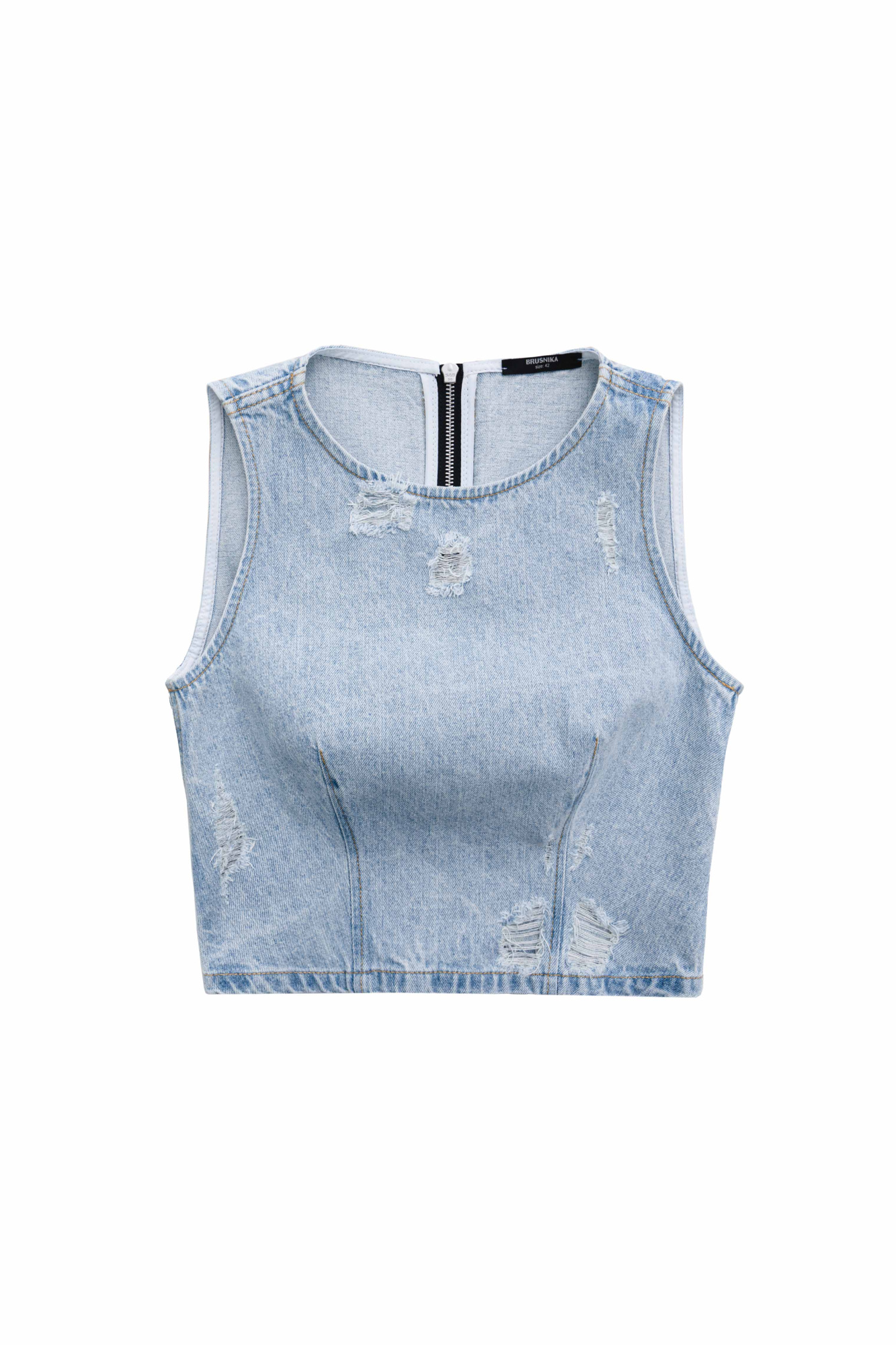 Denim top with slits in grunge style. The model has a fitted silhouette and a zipper on the back. You can complete the look with a matching skirt.