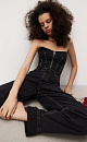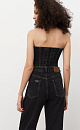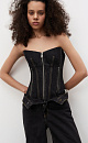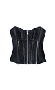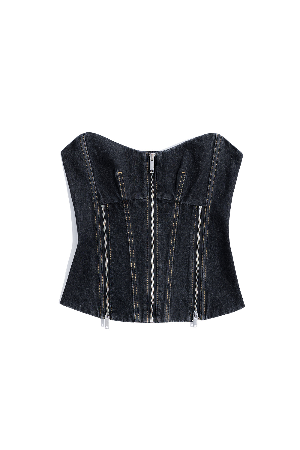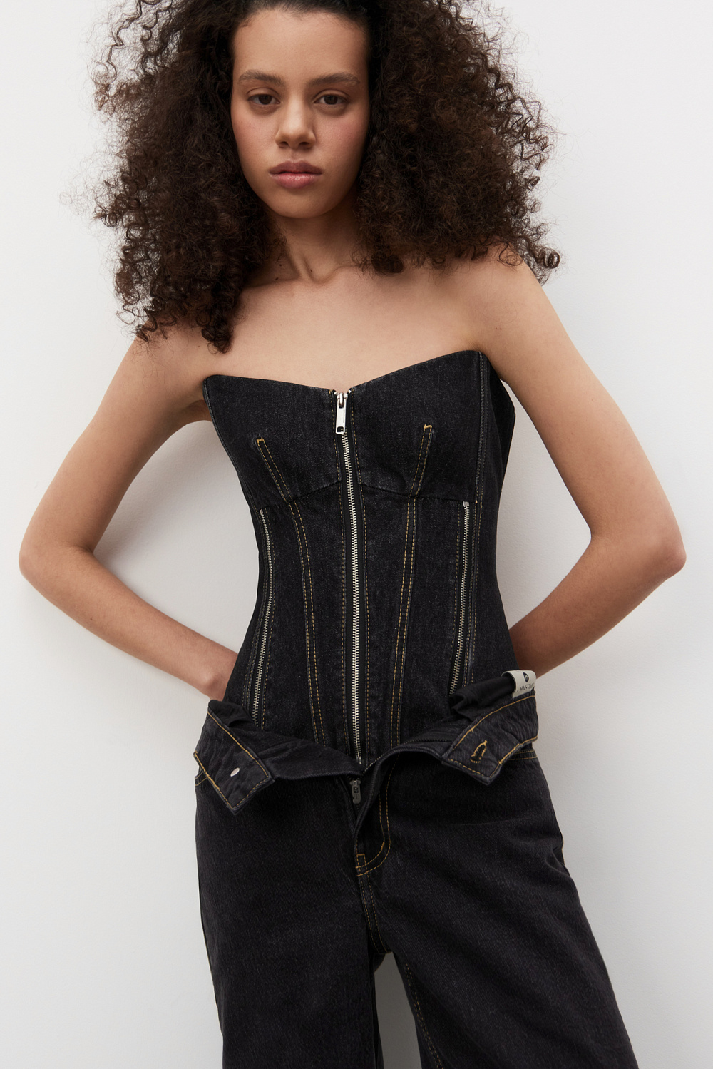 Denim corset made of 100% cotton. Fitted silhouette with accent stitching and front zip fastening. Lace-up back.