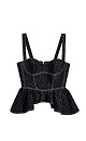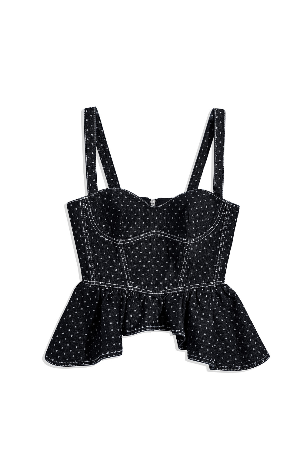 Denim top with polka dot print, 100% cotton. The model has a fitted silhouette with wide straps, a figured bodice, accent stitching and a peplum. Zip fastening at the back.