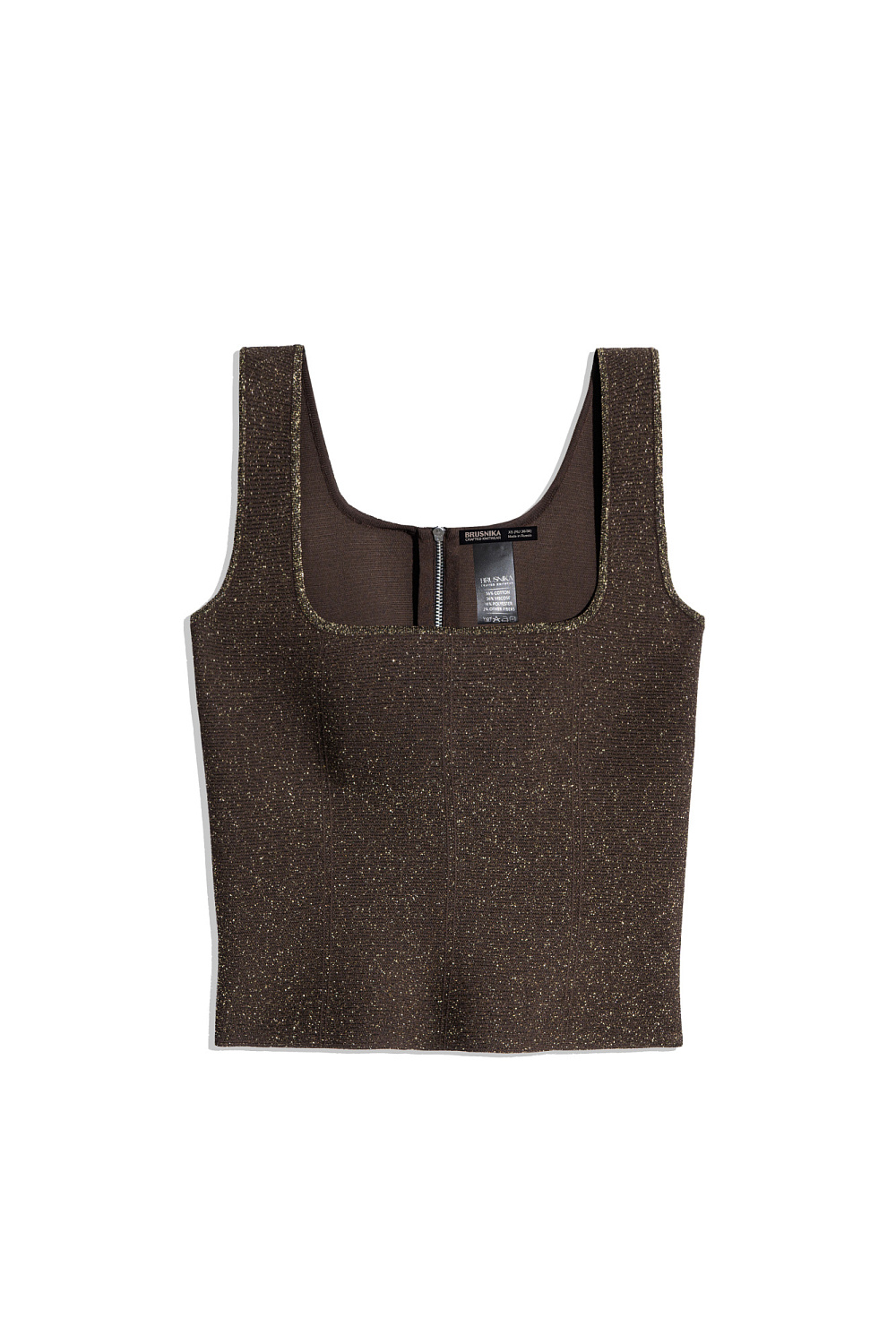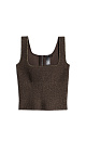 Short viscose knitted corset with luster. The model has a fitted silhouette, a square neckline and wide straps. It is fastened with a zipper at the back.