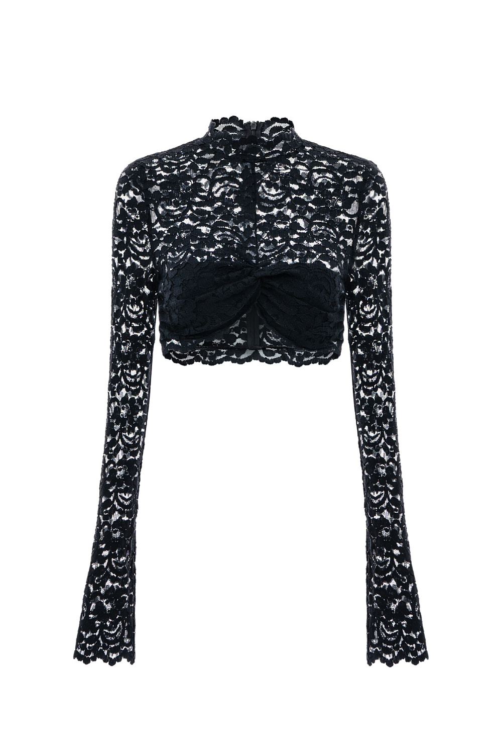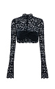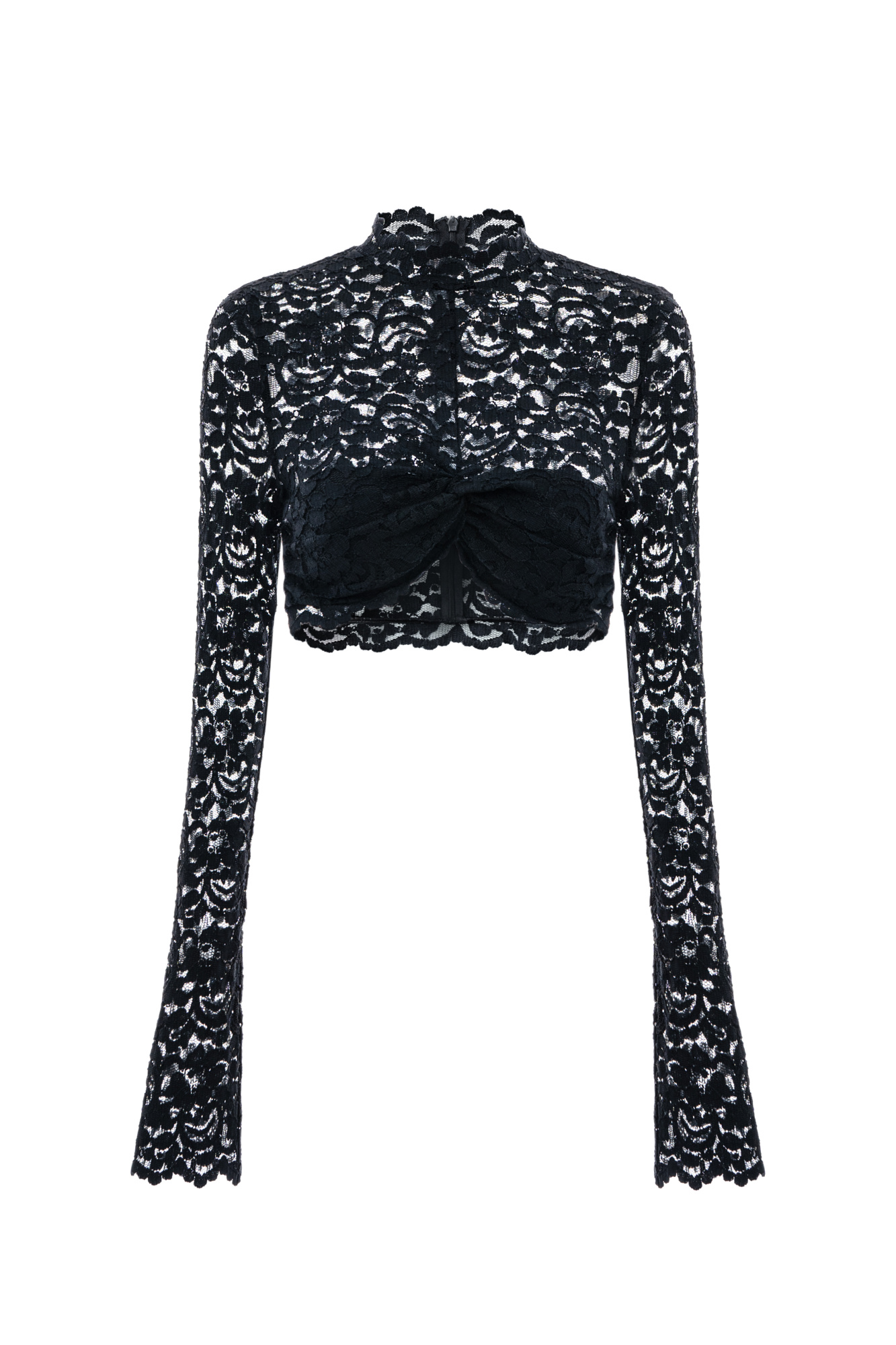 Semi-sheer crop top made of Italian lace. Features a high neck and long sleeves and zipper on the back. The look can be completed with trousers in the same style.