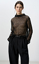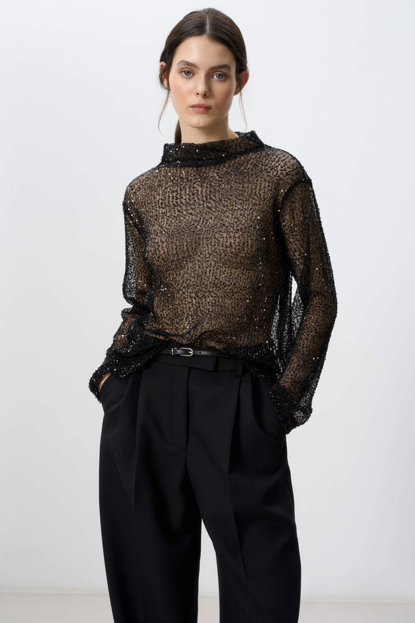 A transparent top with long sleeves and a stand collar. The model is decorated with sequins.