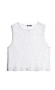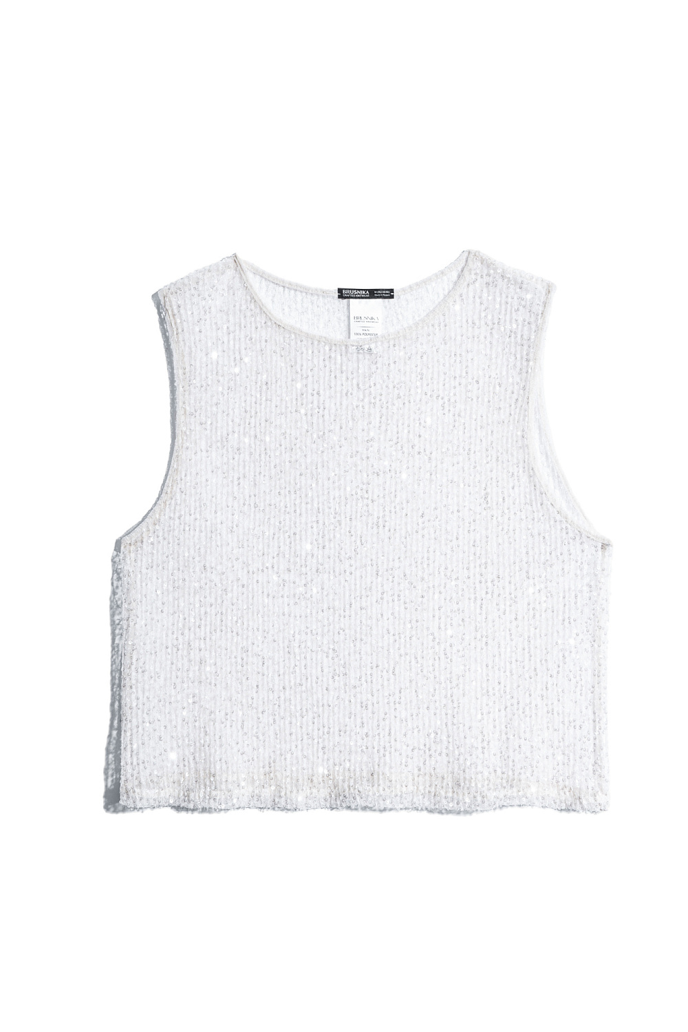 A transparent sleeveless top with a round neckline. The model is decorated with sequins.