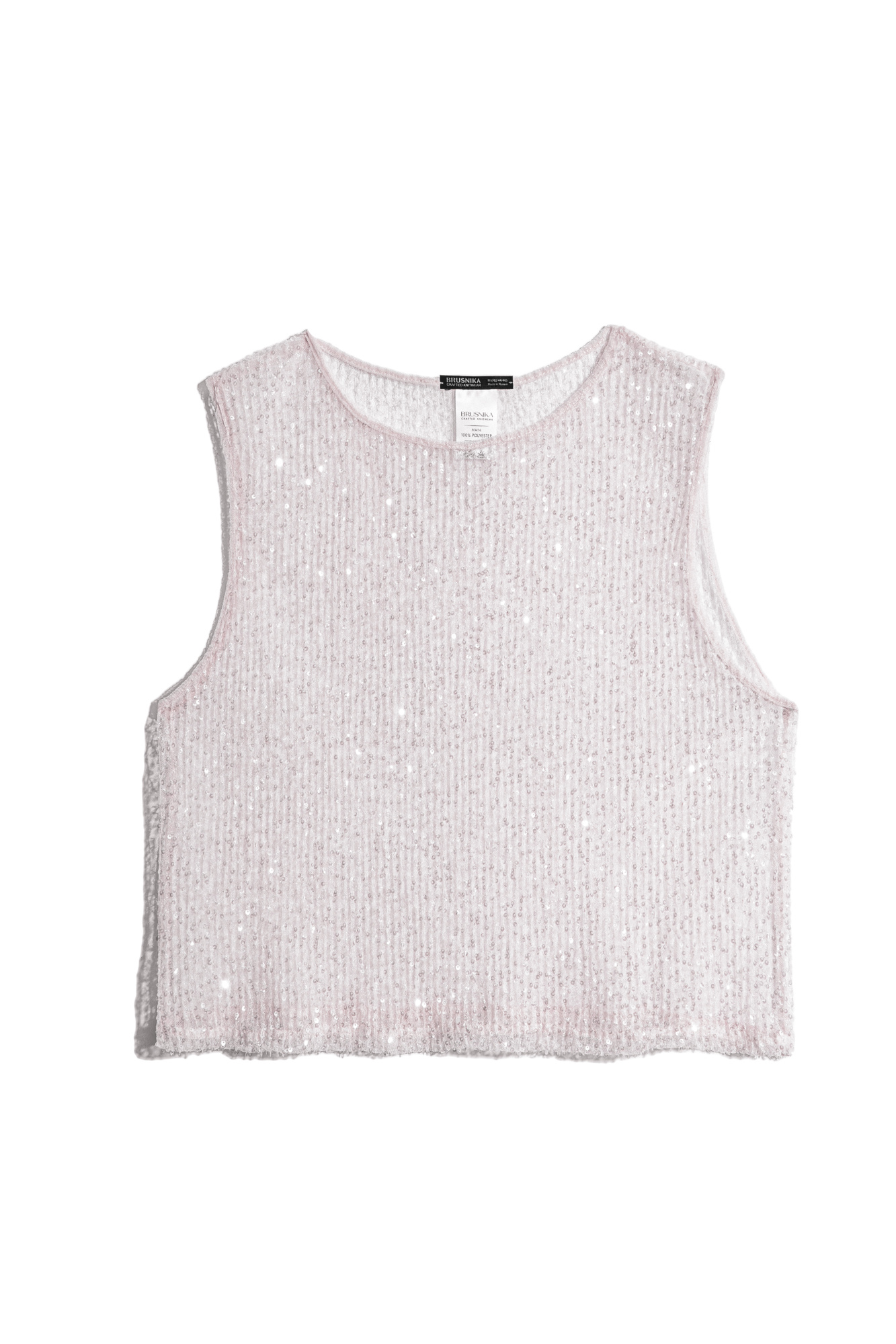 A transparent sleeveless top with a round neckline. The model is decorated with sequins.