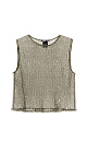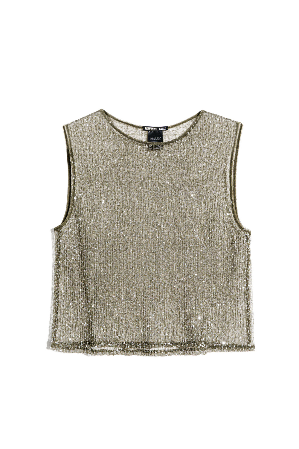 A transparent sleeveless top with a round neckline. The model is decorated with sequins.