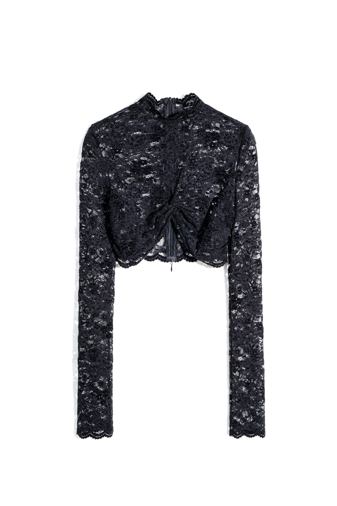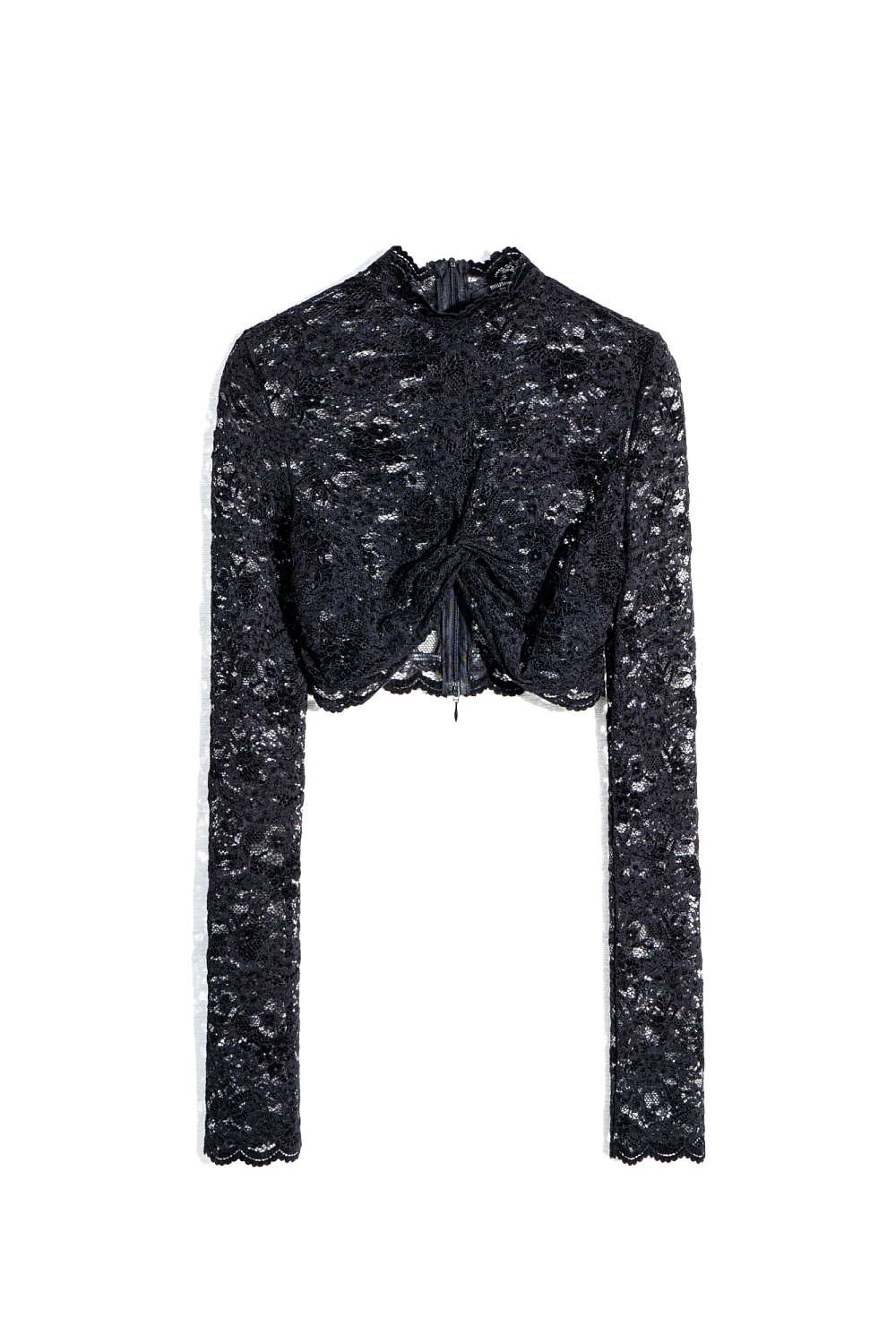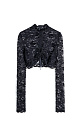 A cropped lace top with a twist on the bodice. It has long sleeves and a stand collar. You can complete the look with trousers in the same style.