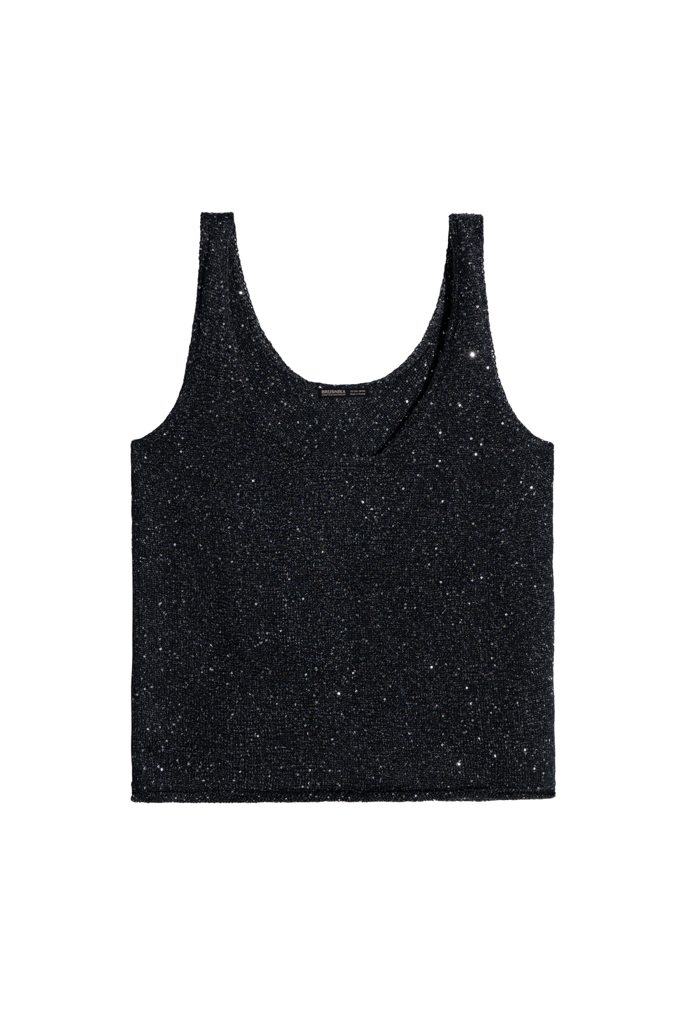 Cotton knit top with sequins. Straight-cut model with straps and a deep neckline.