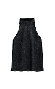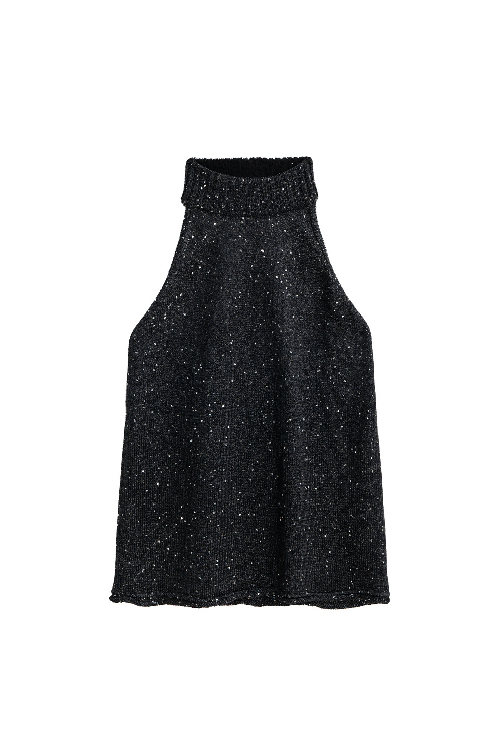 Cotton knit top with sequins. Loose-fitting model with an American collar, high neckline, and open back.