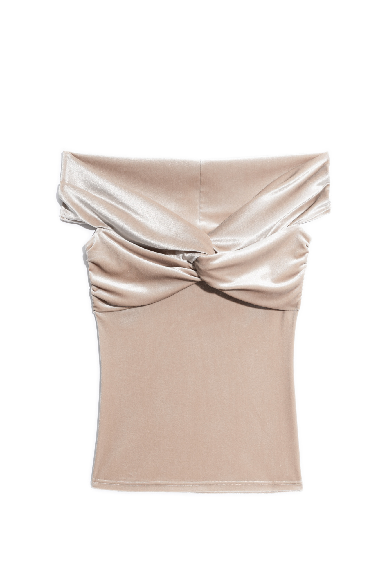 Velvet top made of polyamide with viscose added. The model has a fitted silhouette, is sleeveless, with an open shoulder line. The product is decorated with a twist on the chest and a drape on the bodice.