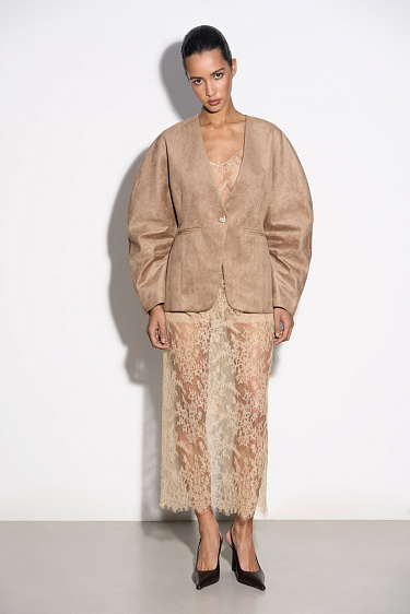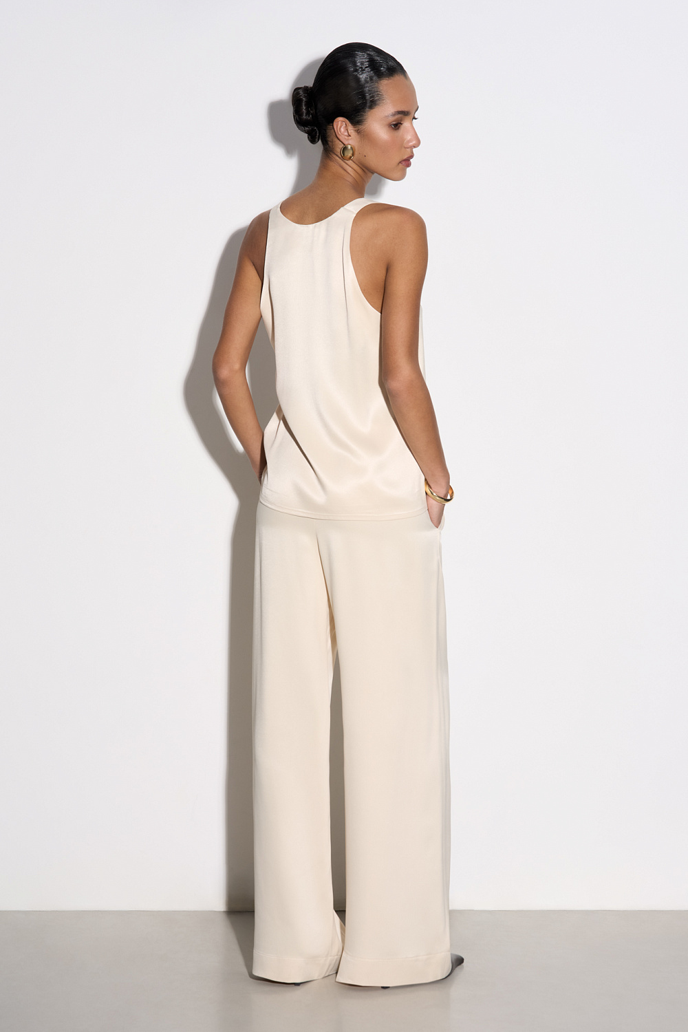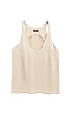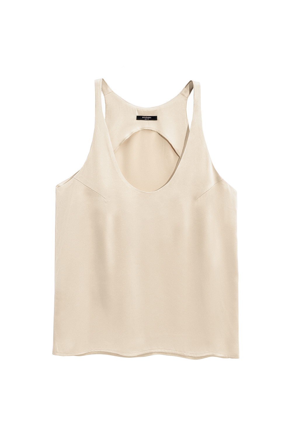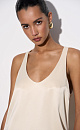 T-shirt made of satin viscose. The model has a loose silhouette with thin straps and a deep neckline.