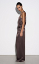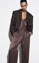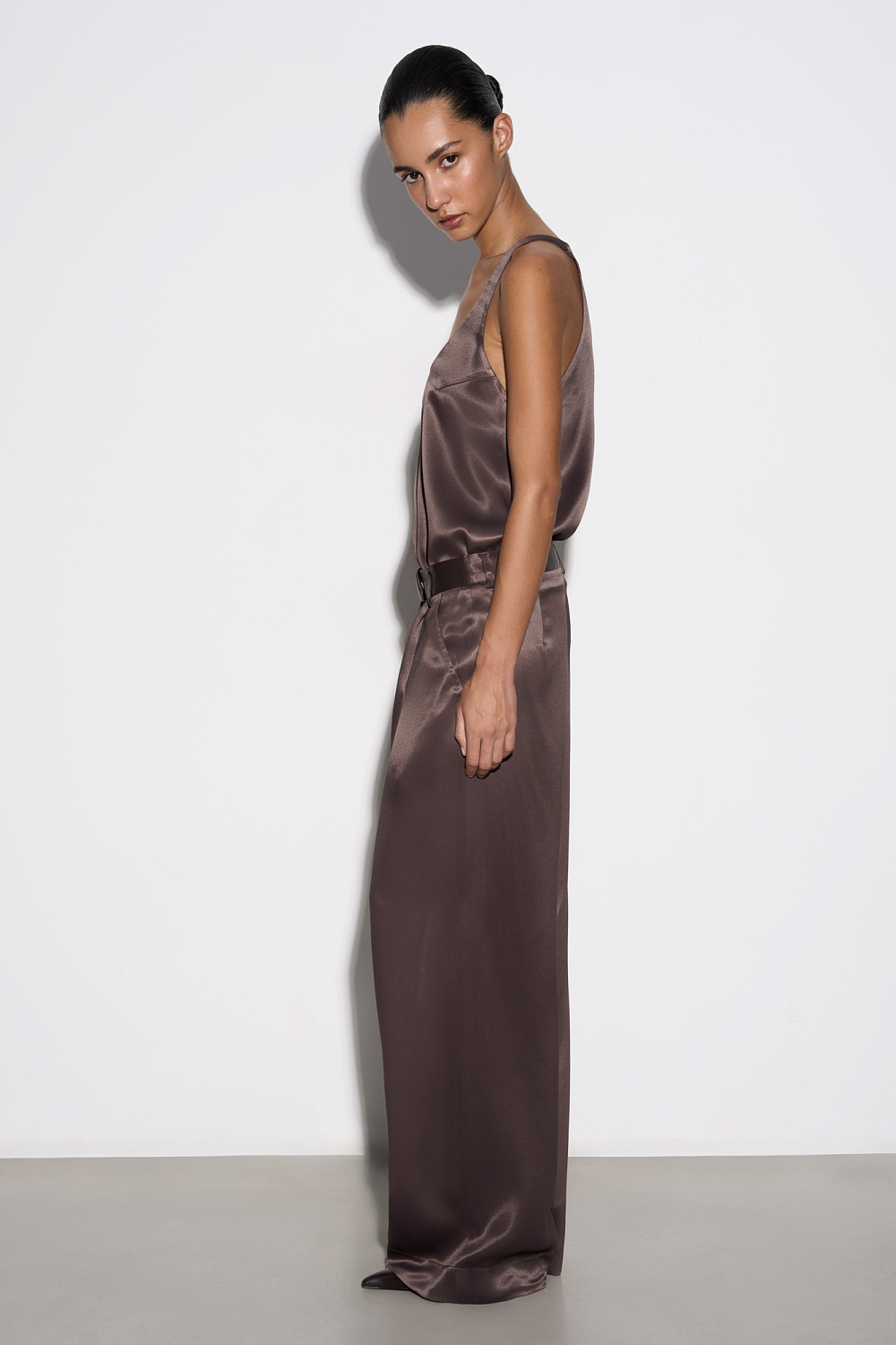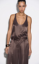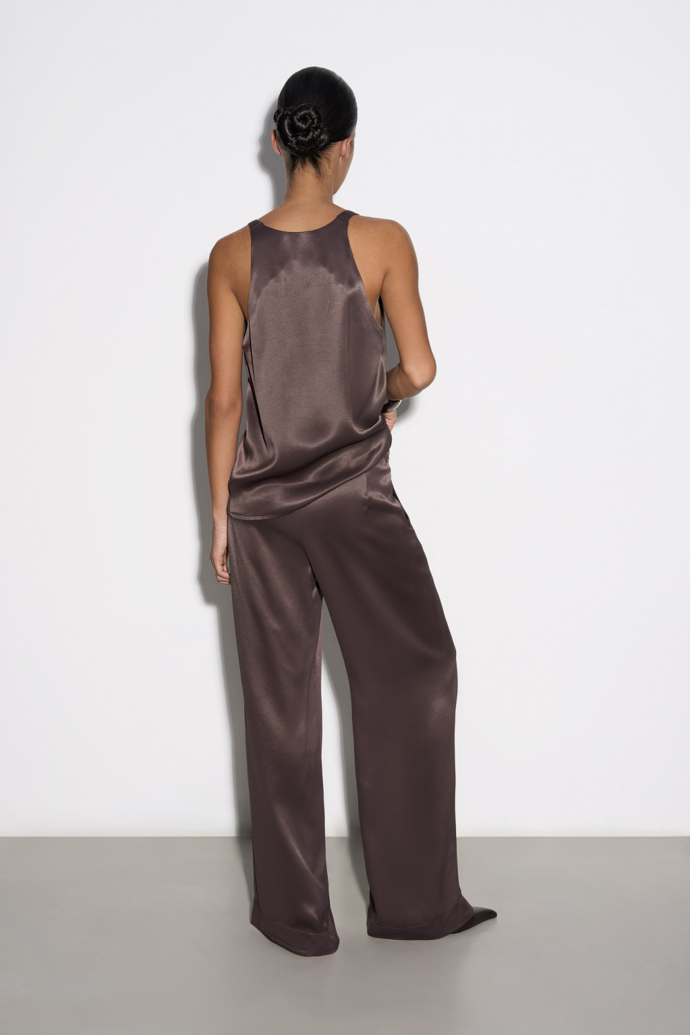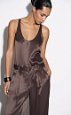 T-shirt made of satin viscose. The model has a loose silhouette with thin straps and a deep neckline.