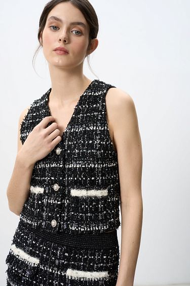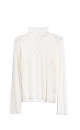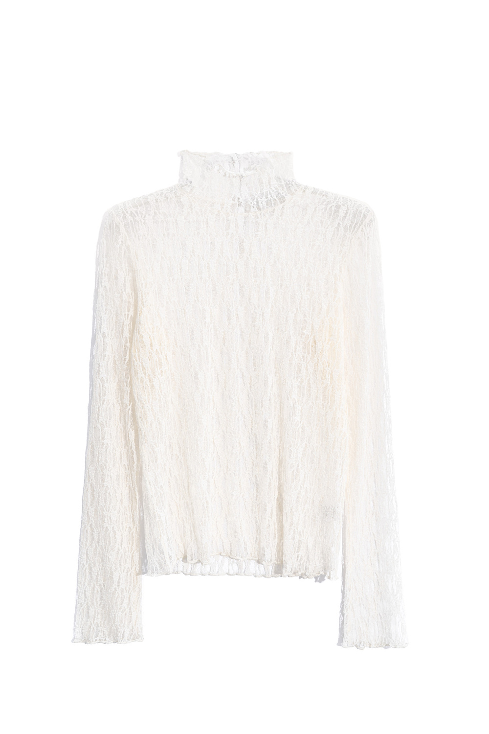 Translucent lace top. Model with long sleeves flared to the cuffs and a stand-up collar with buttons. The product is unlined.