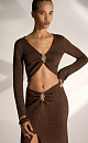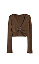 Knitted top made of viscose with lurex. The model features a cropped silhouette with long sleeves, rolled cuffs, a deep V-neckline and an accent detail on the bodice.