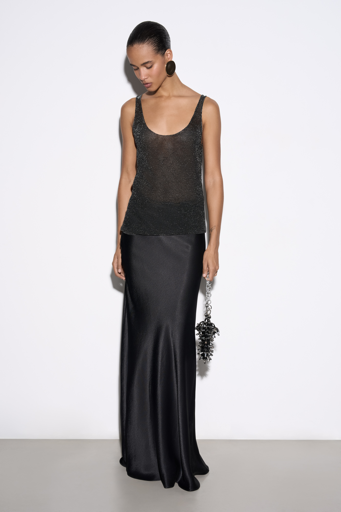 Translucent one-piece knitted T-shirt made of viscose with the addition of lurex. The model has a loose silhouette with thin straps and a deep neckline.