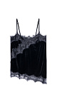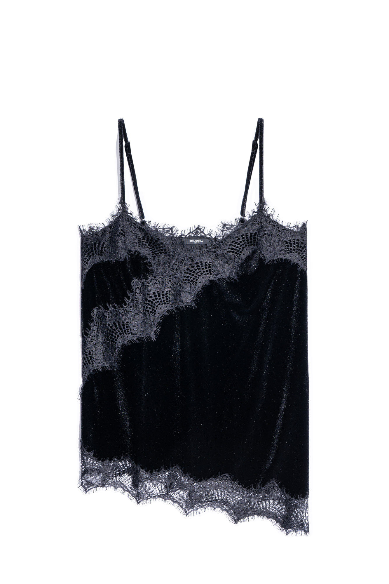 Top made of velvet viscose, decorated with thin lace. The model has an asymmetrical cut, with a deep neckline and thin straps.