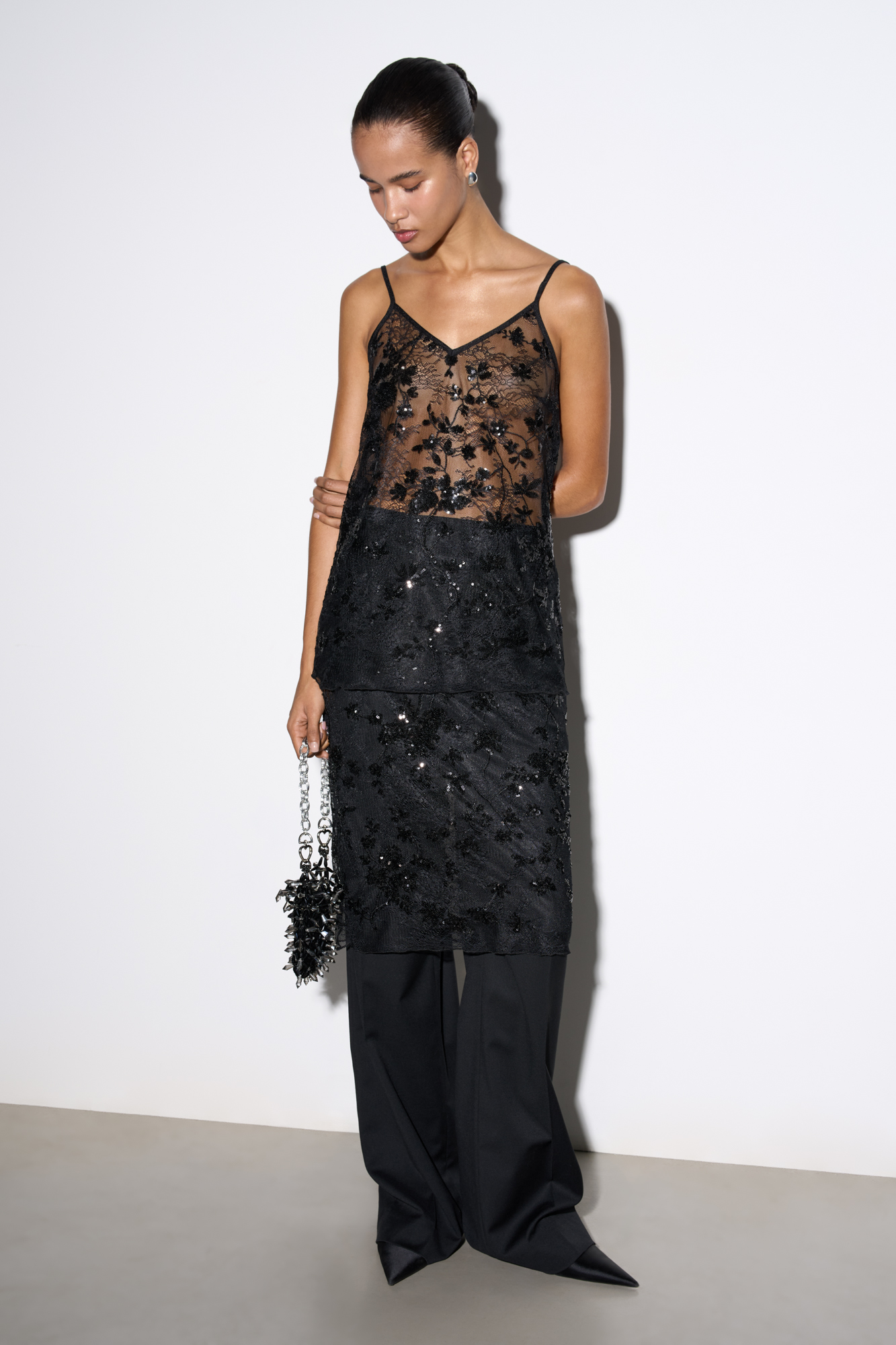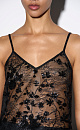 Lace top with floral patterns, embroidered with sequins. Loose silhouette model with thin adjustable straps.