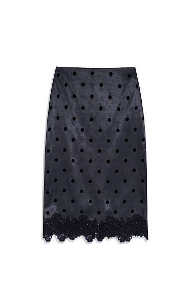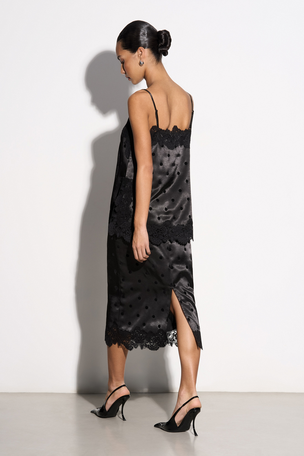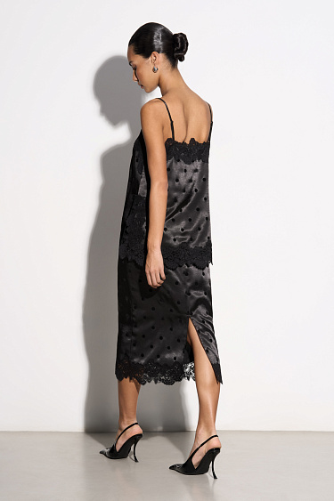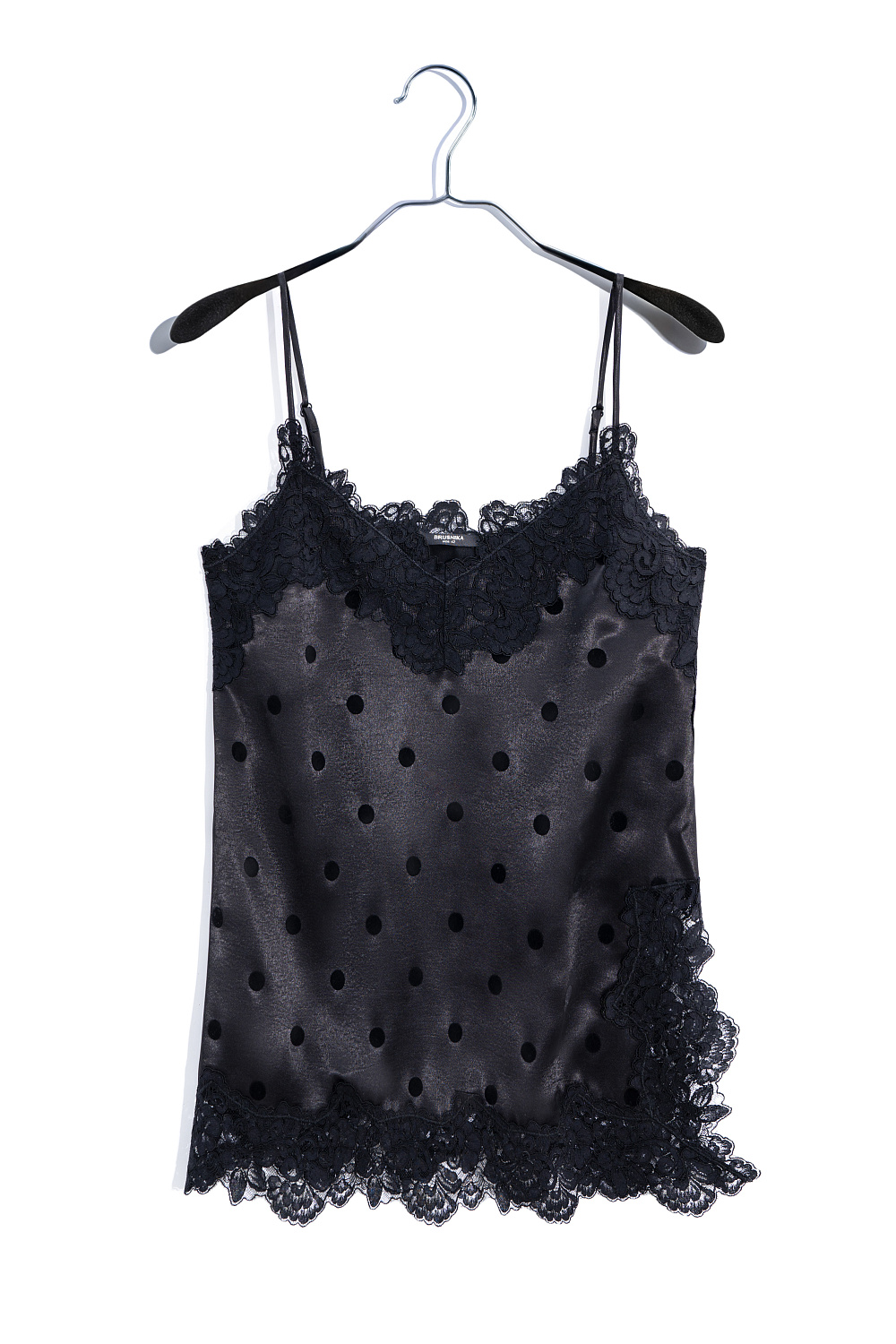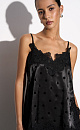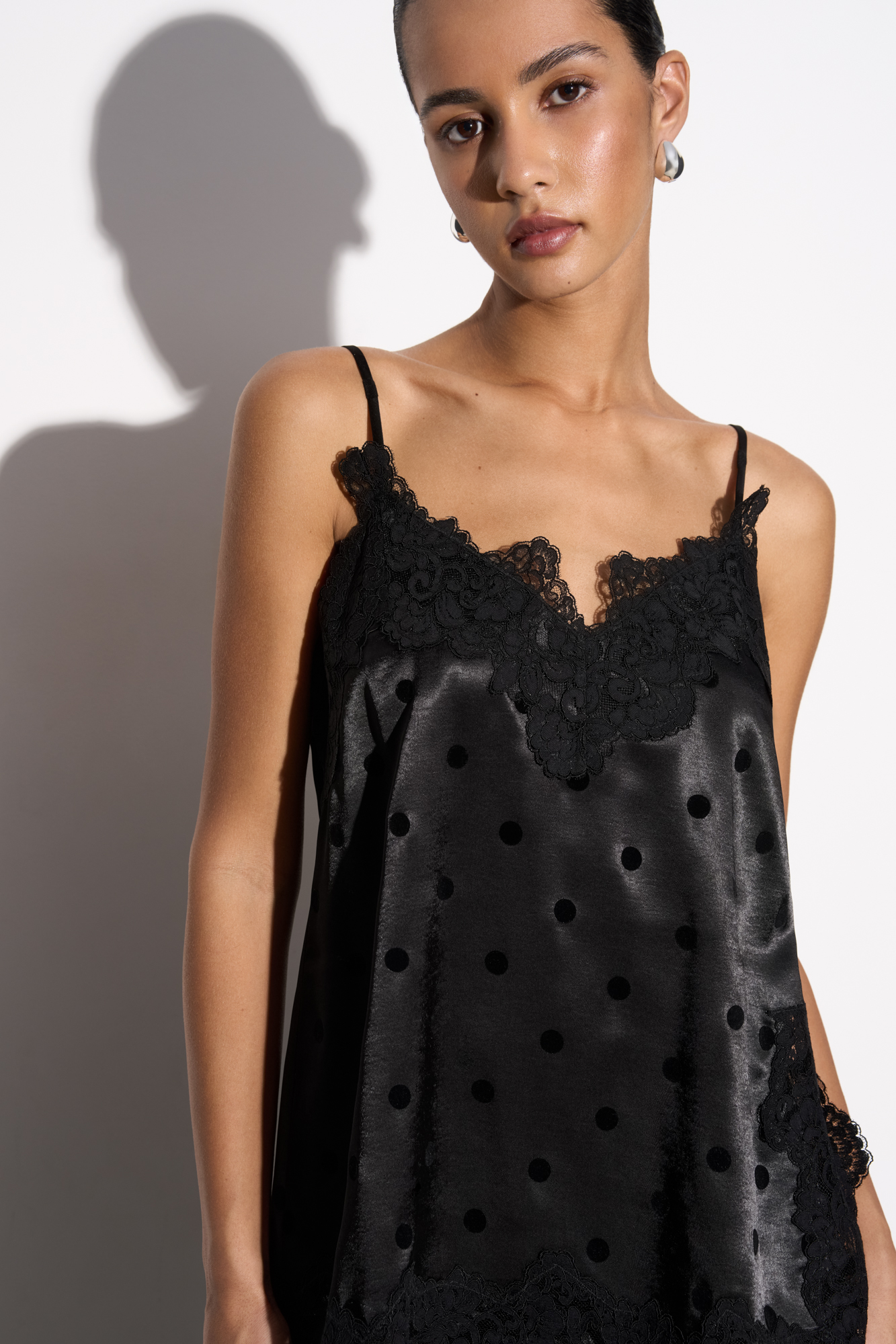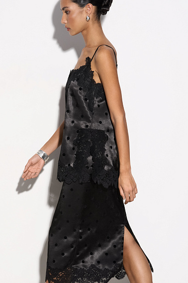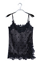 Satin top with polka dots. Model with thin straps. The product is decorated with thin lace.