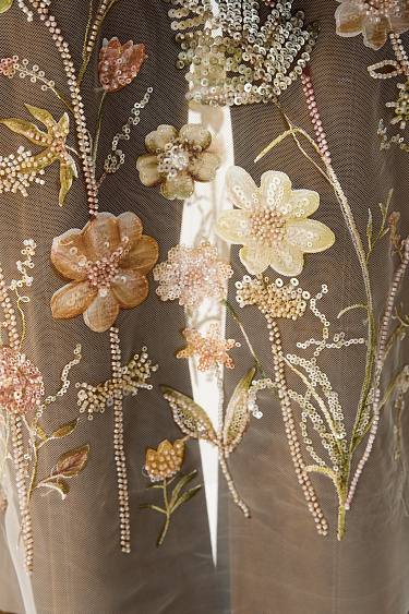 Sheer top with floral patterns embroidered with sequins and beads. Sleeveless model with a deep U-neck.