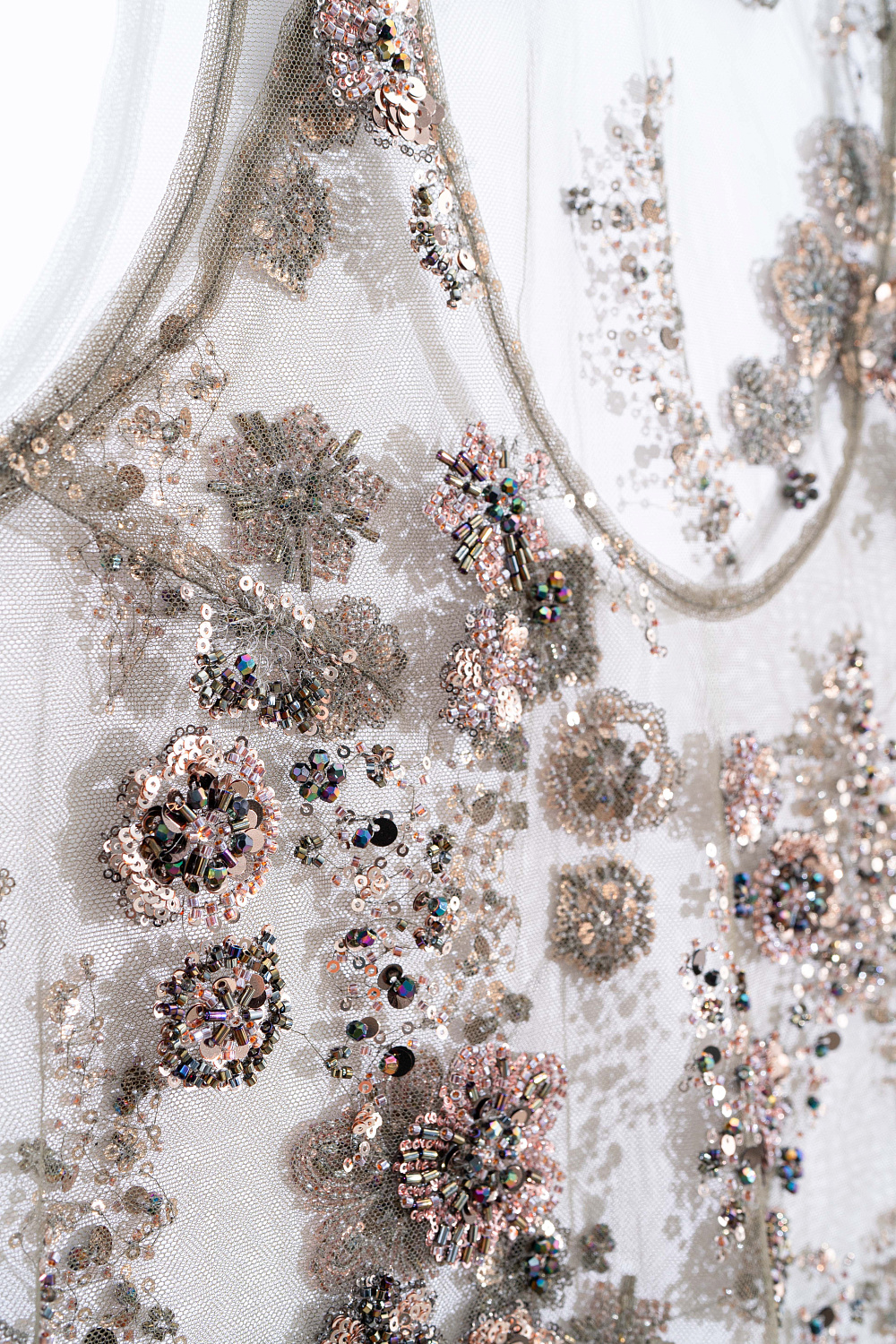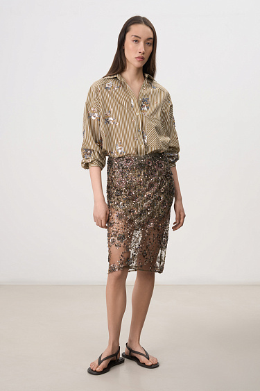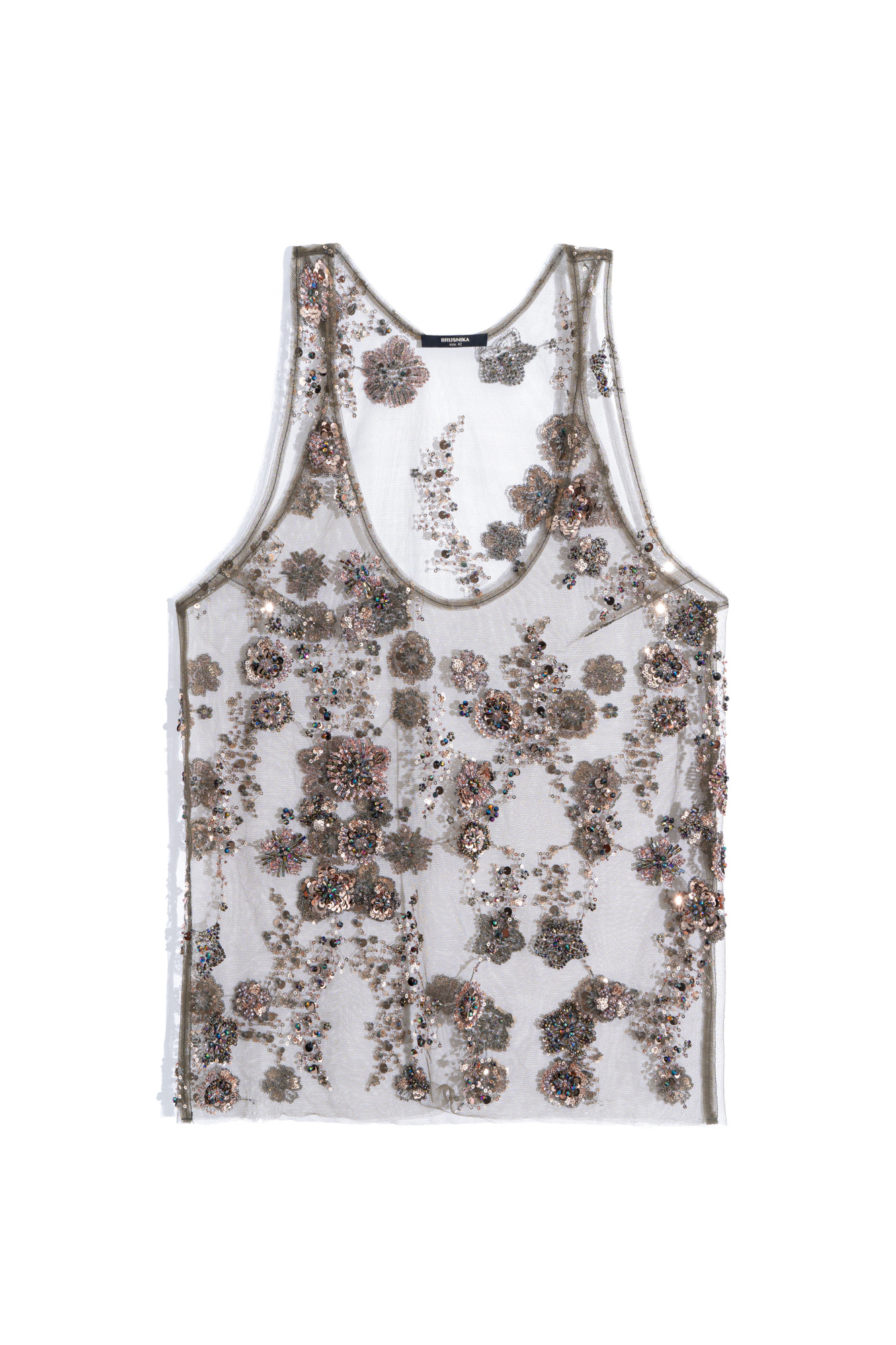 Sheer top with floral patterns embroidered with sequins and beads. Sleeveless model with a deep U-neck.