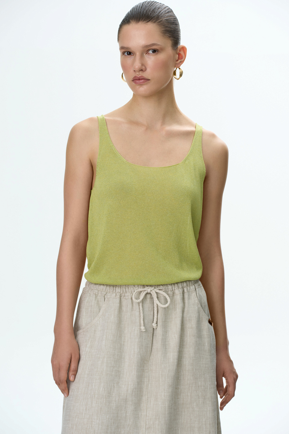 Fully knitted semi-sheer viscose top. Round neckline and thin straps.